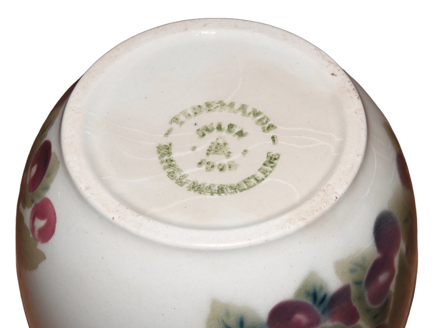 Låget har et stort skår og der er lidt misfarvninger i glasuren på underdelen, se venligst fotos, men ellers fejlfri stand.