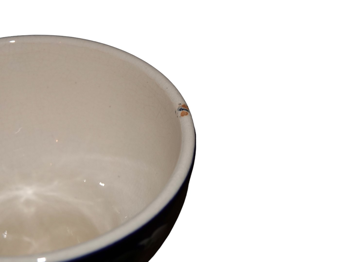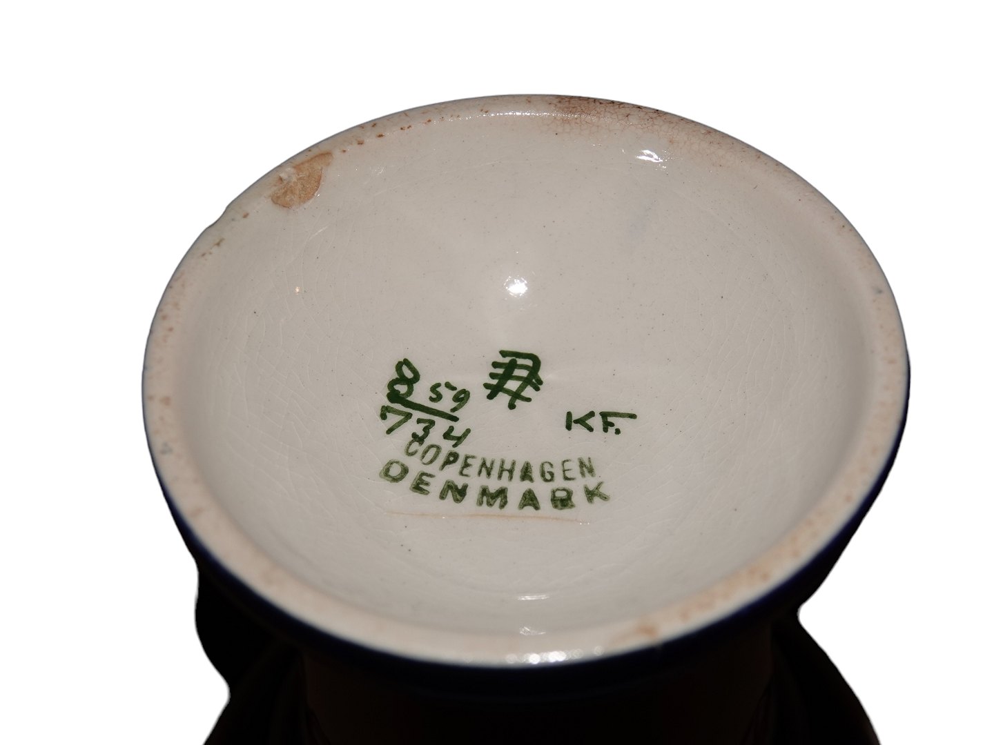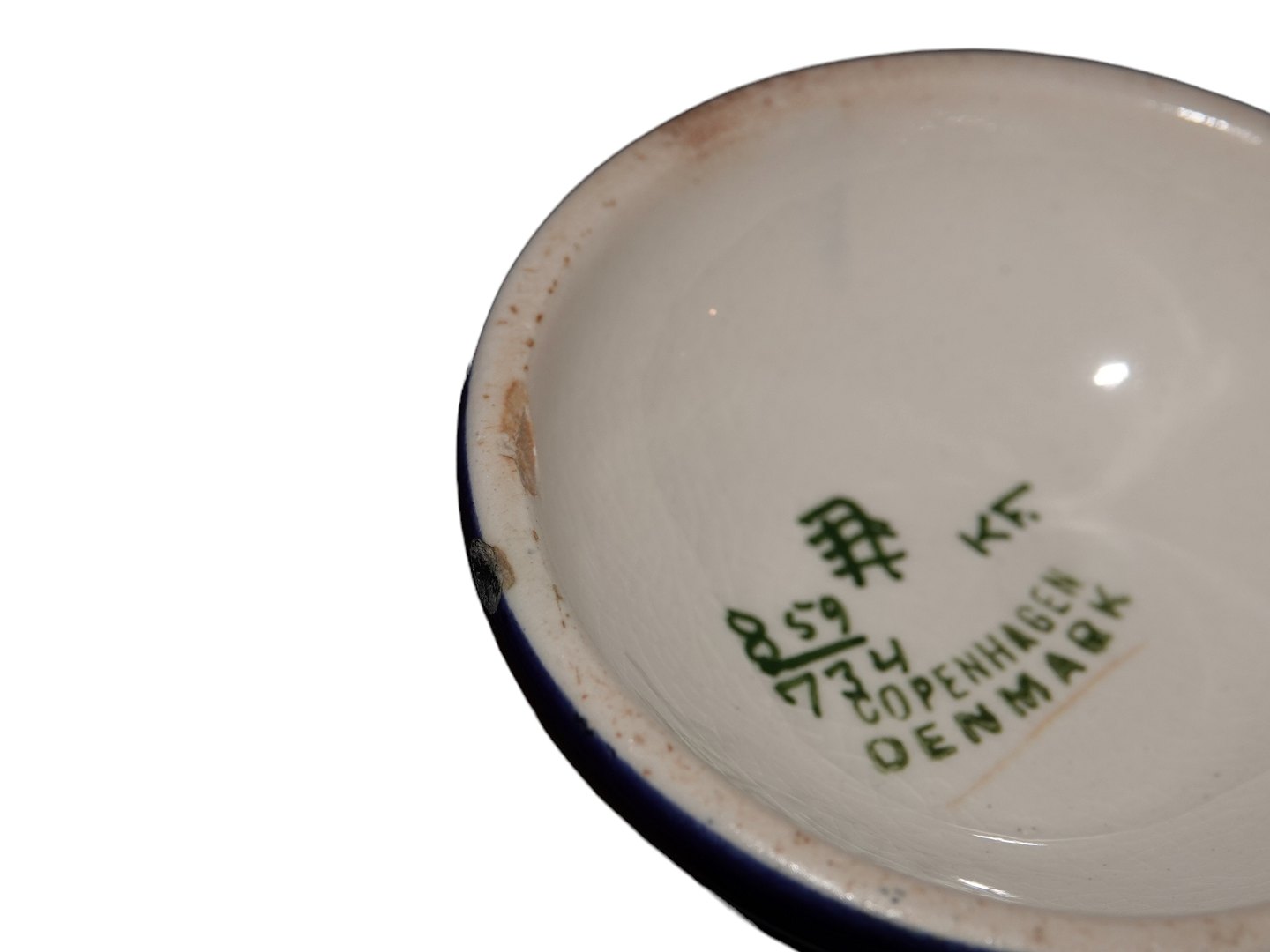 Der er et glasurafslag på topkanten samt et skår ved bundkanten, se fotos, ellers fin stand uden fejl.