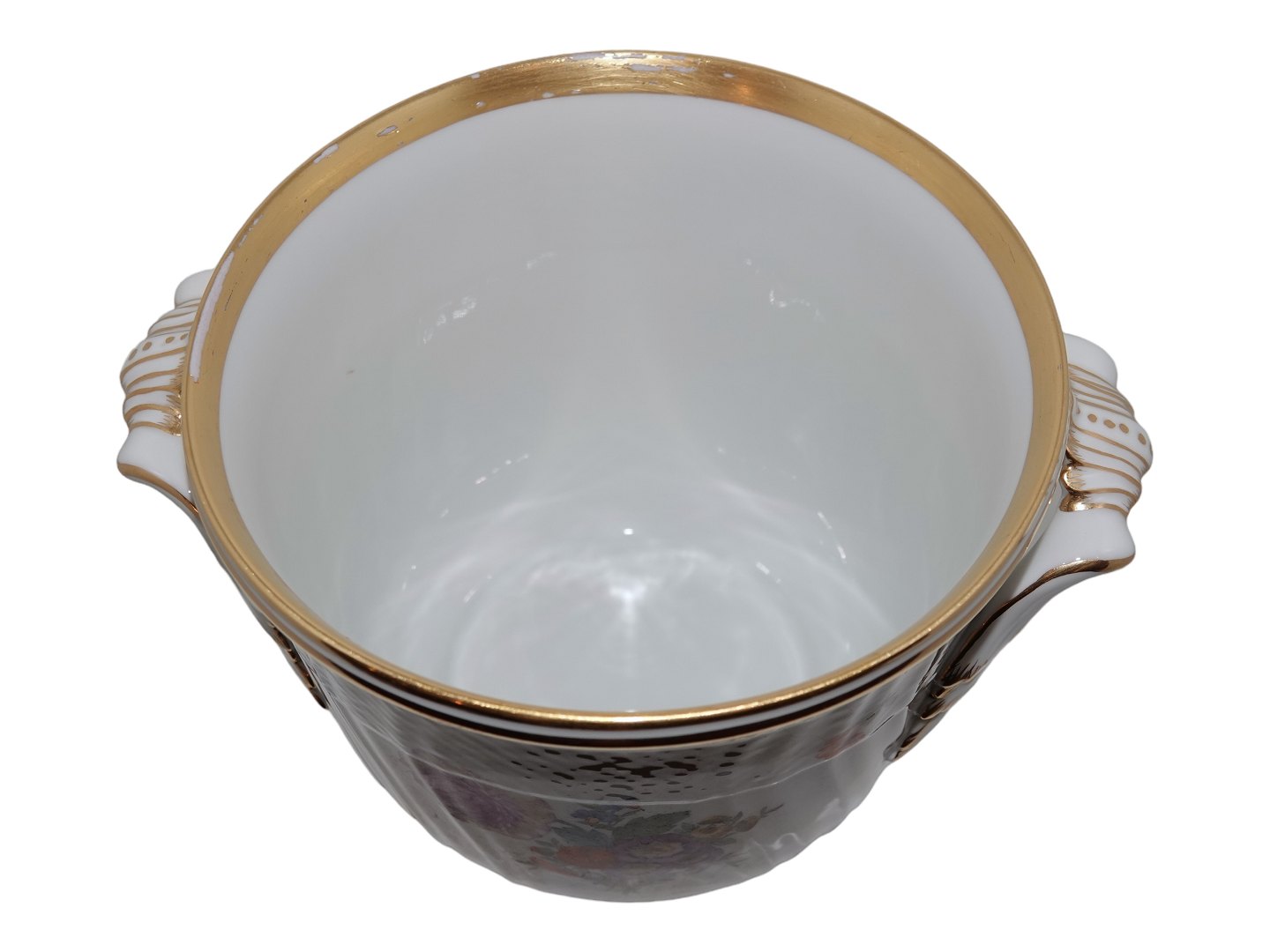 Der er lidt slid på den øverste indre guldkant, ellers perfekt stand uden fejl.