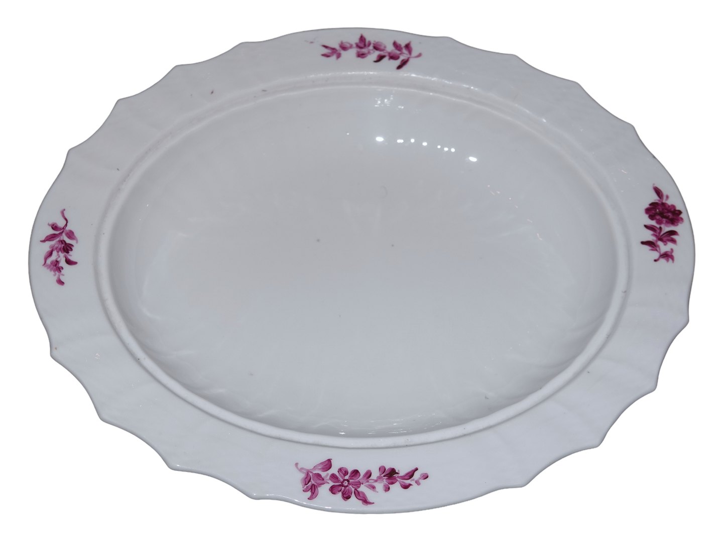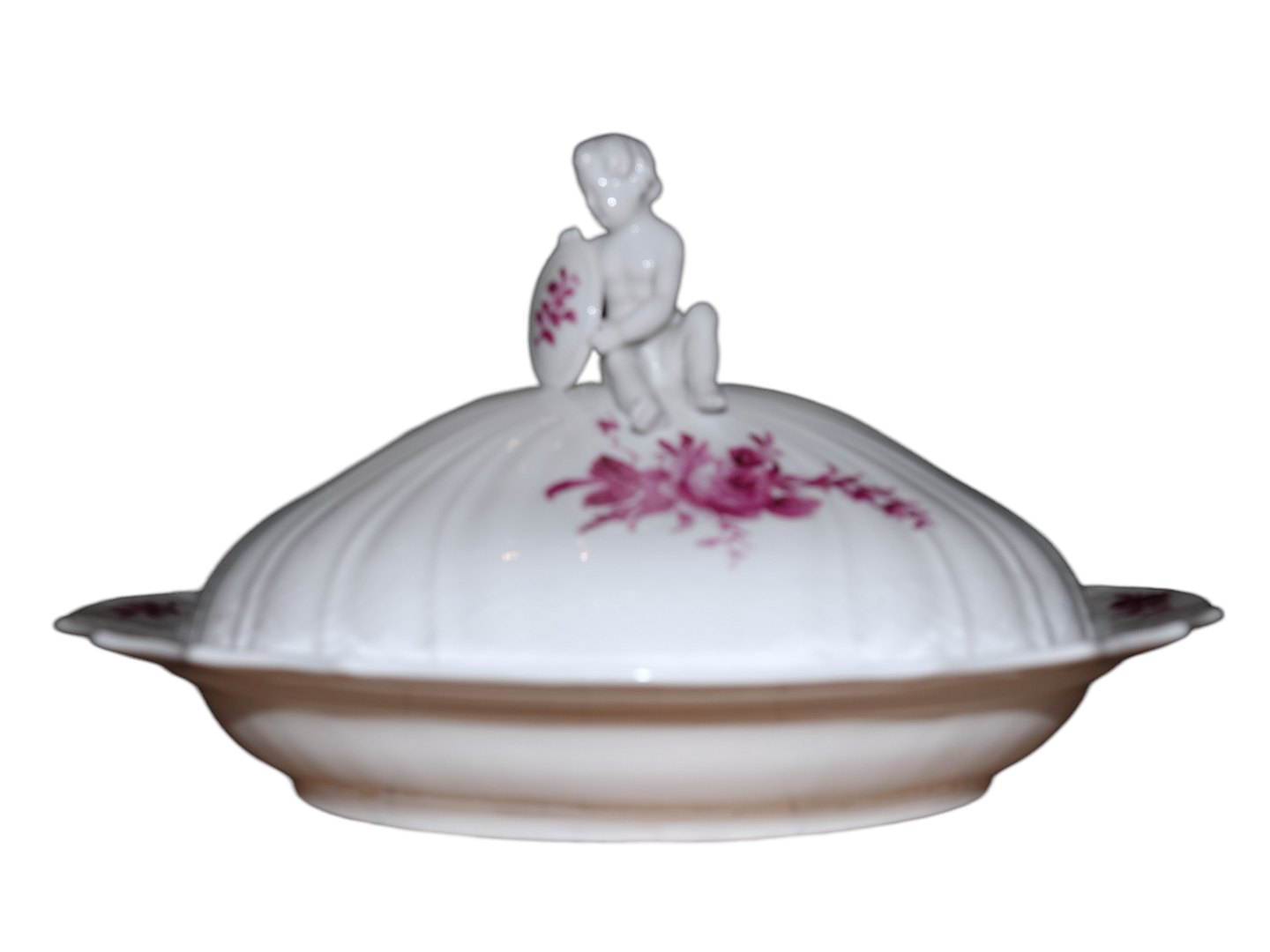 Royal Copenhagen Purpur Blomst Svejfet, stort lågfad med putti figur på toppen. Denne er produceret mellem 1860 og 1893. 1. sortering. Længde 34,9 cm. Perfekt stand uden fejl.