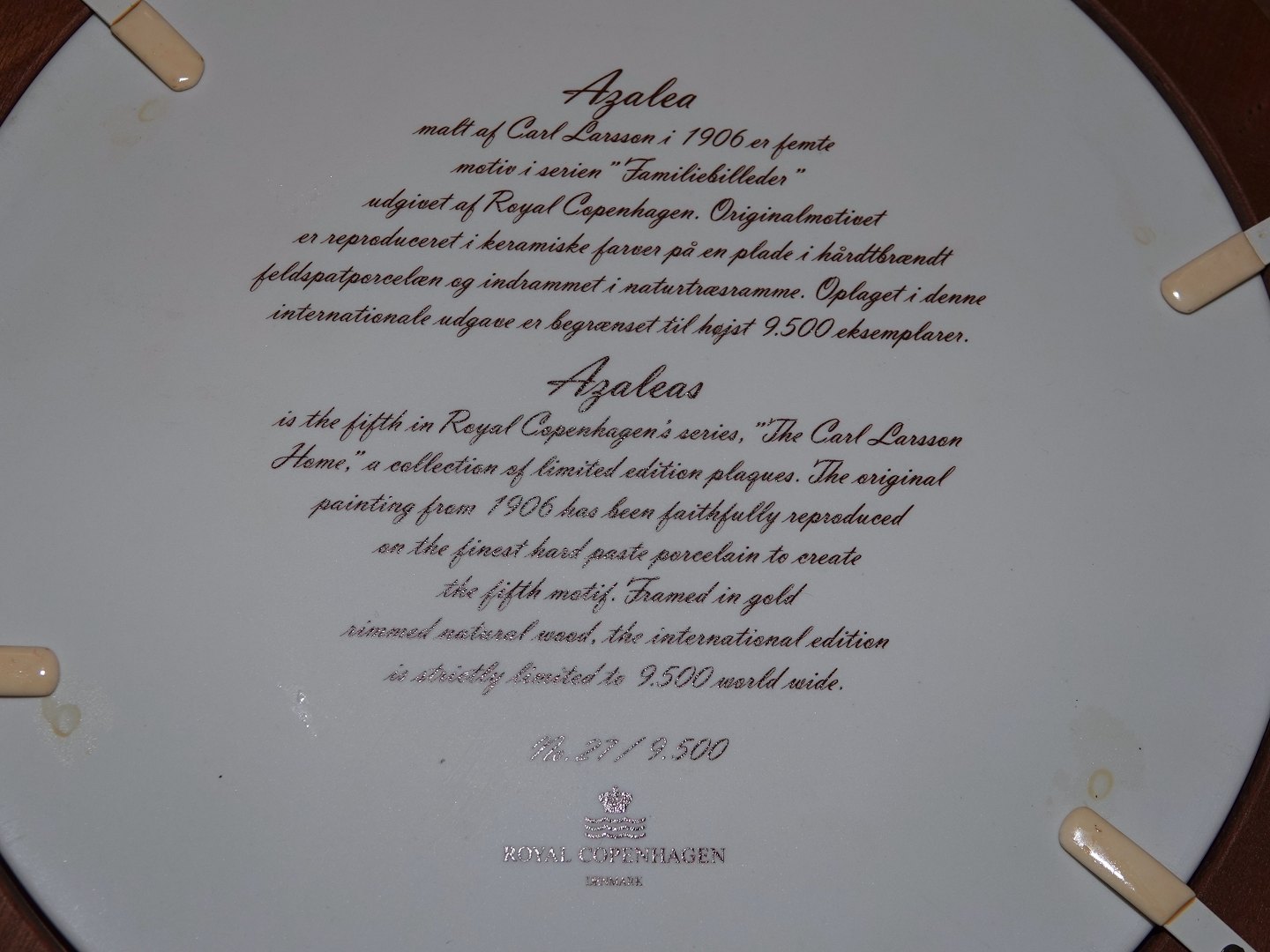 Royal Copenhagen Carl Larsson platte i mørk træramme, Azalea.