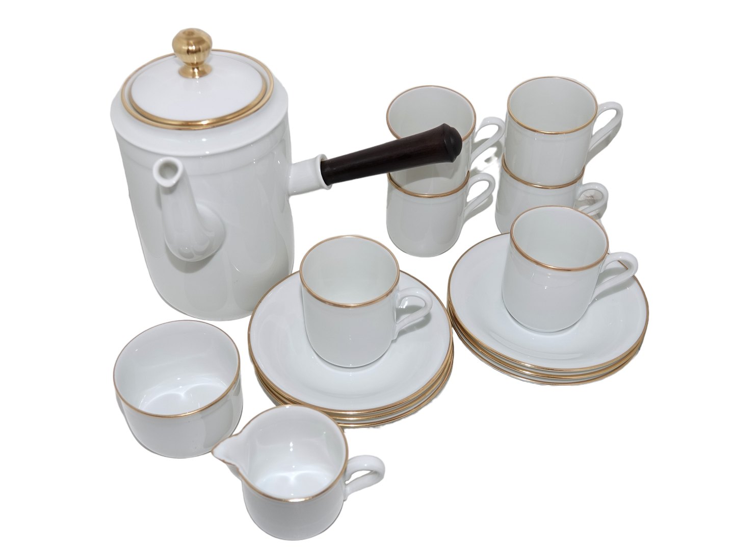 Sæt med lille kaffekande, espressokopper, sukkerskål og flødekande