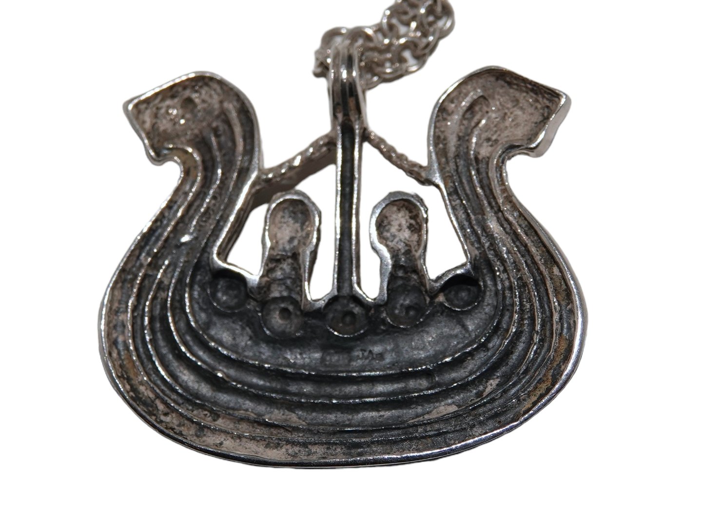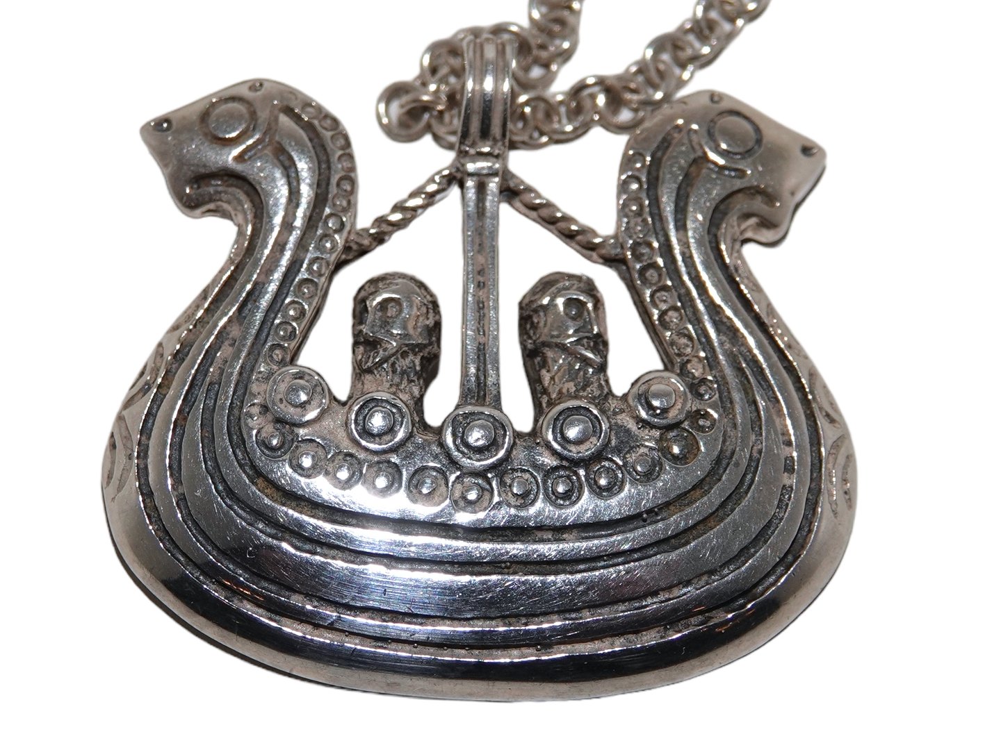 Sterlingsølv, vikingeskib vedhæng med halskæde i kraftig kvalitet. Formentlig fra Norge. Stemplet "925 JA". Vedhænget måler 4,0 x 3,6 cm., kæden måler 45,0 cm. Fin og velholdt stand.