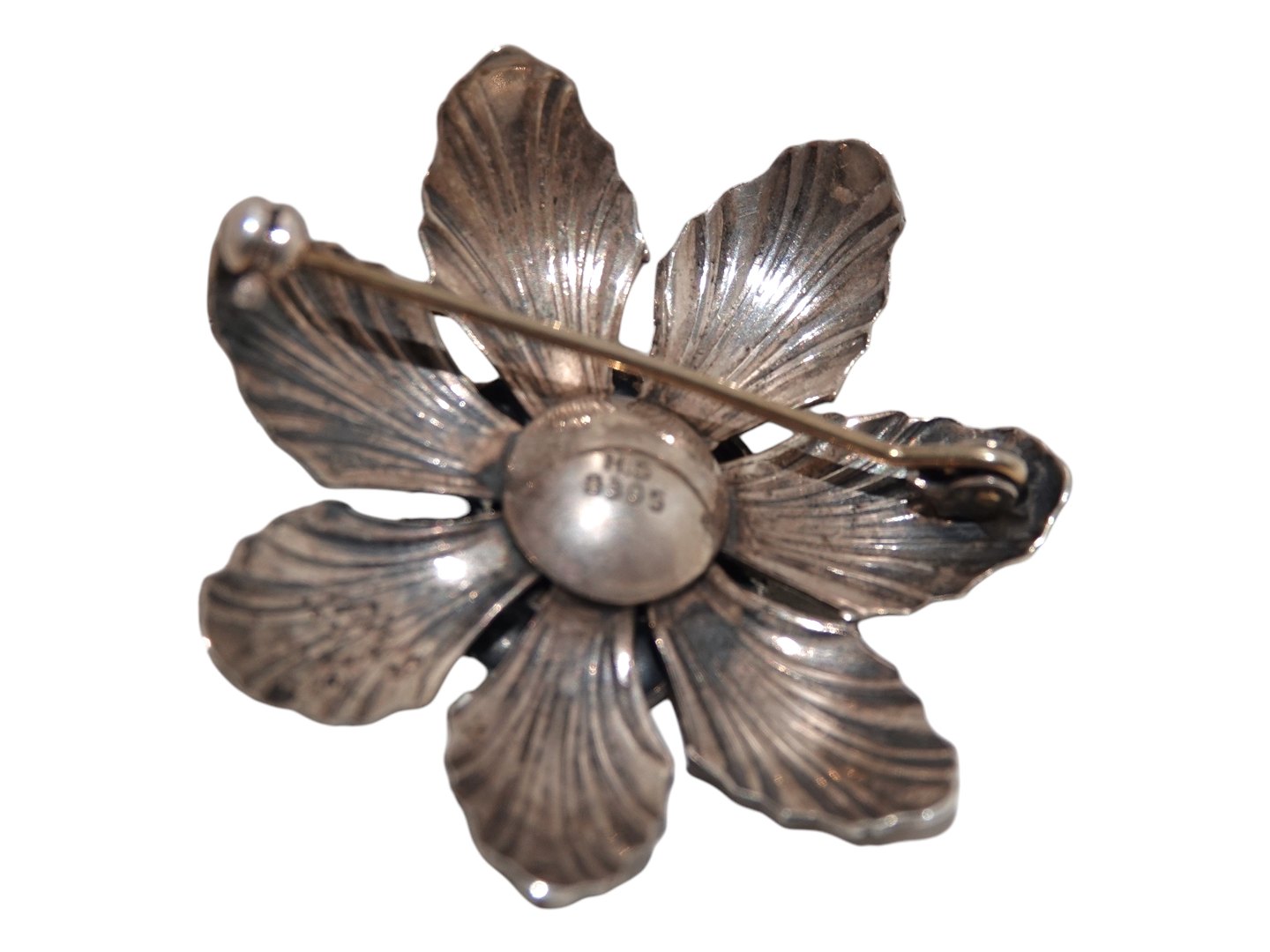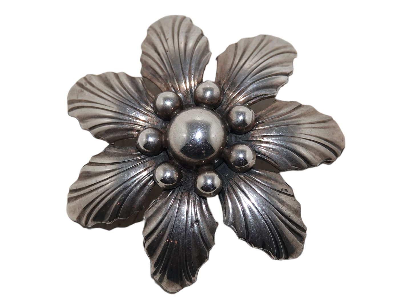 Sølv broche i form af blomst fra ca. 1960. Stemplet "HS 830S". Herman Siersbøl var sølvsmed i Kastrup fra 1948 til ca 2000. Diameter 4,0 cm. Fin og velholdt stand.