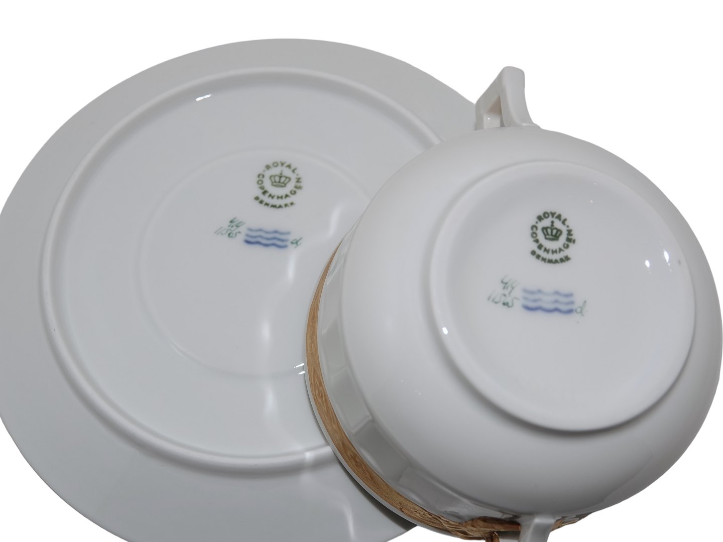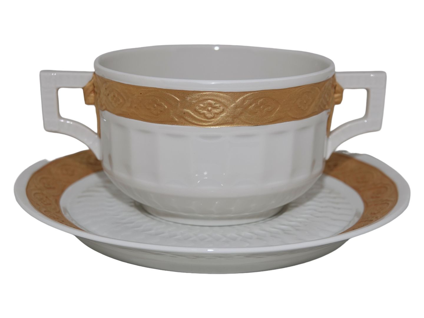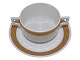 Royal Copenhagen Guld Vifte, stor bouillionkop med tilhørende underkop. Dekorationsnummer 414/11565. 1. sortering. Diameter på koppen er 10,0 cm. Perfekt stand uden fejl.