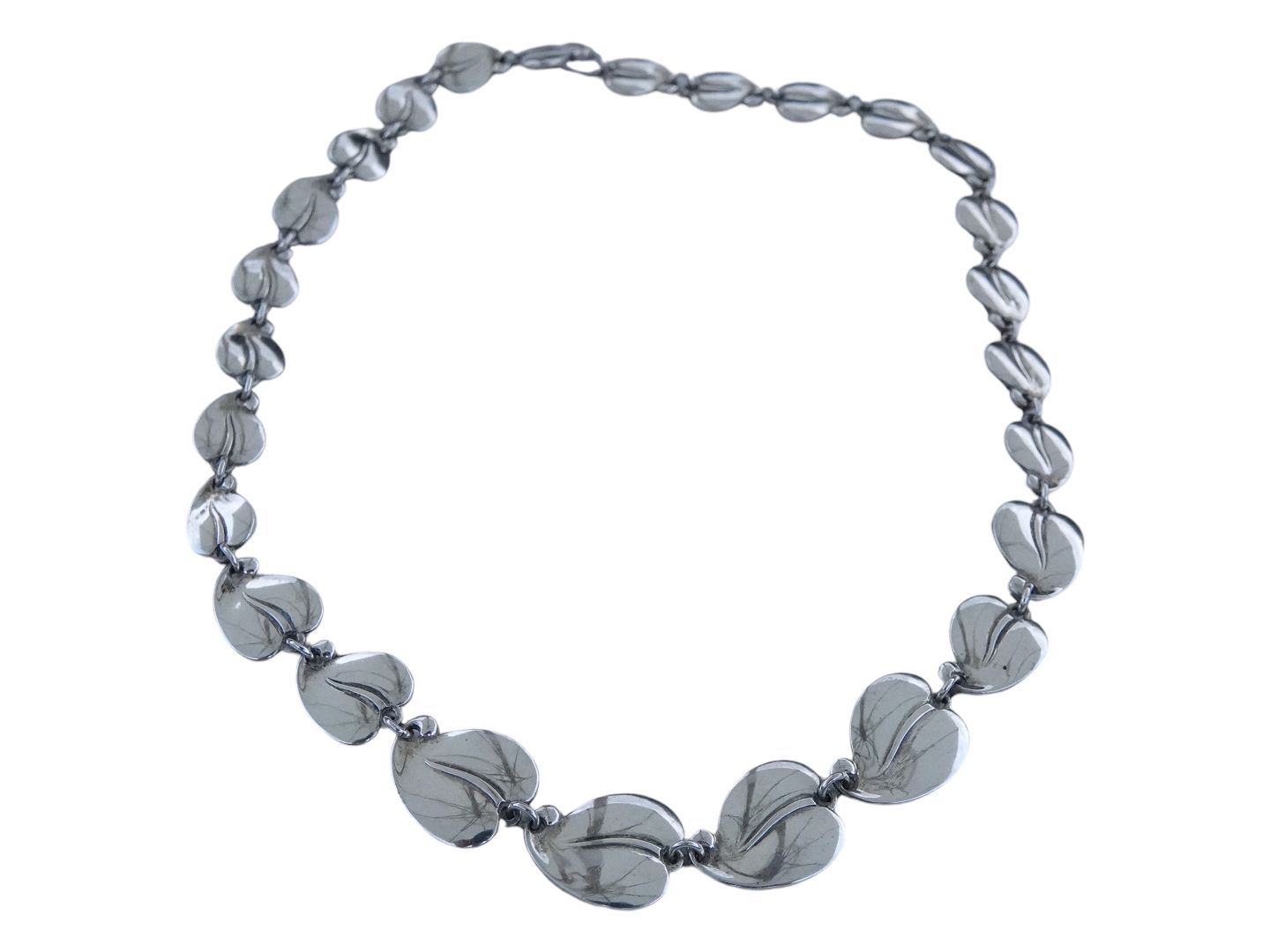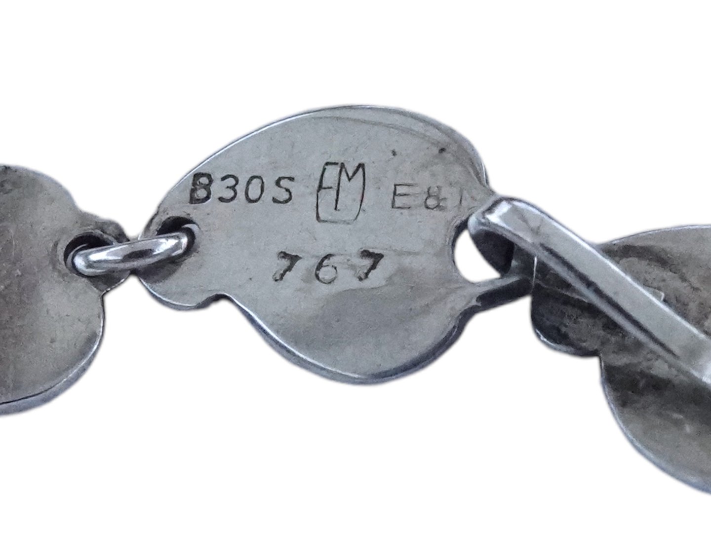 Erik Magnussen sølv, moderne kraftig halskæde fra ca. 1940 til 1950. Designnummer 767. Stemplet "EM 830S 767". Erik Magnussen var sølvsmed i Danmark og USA fra 1902 til 1961. Længde 39,5 cm. Fin og velholdt stand.
