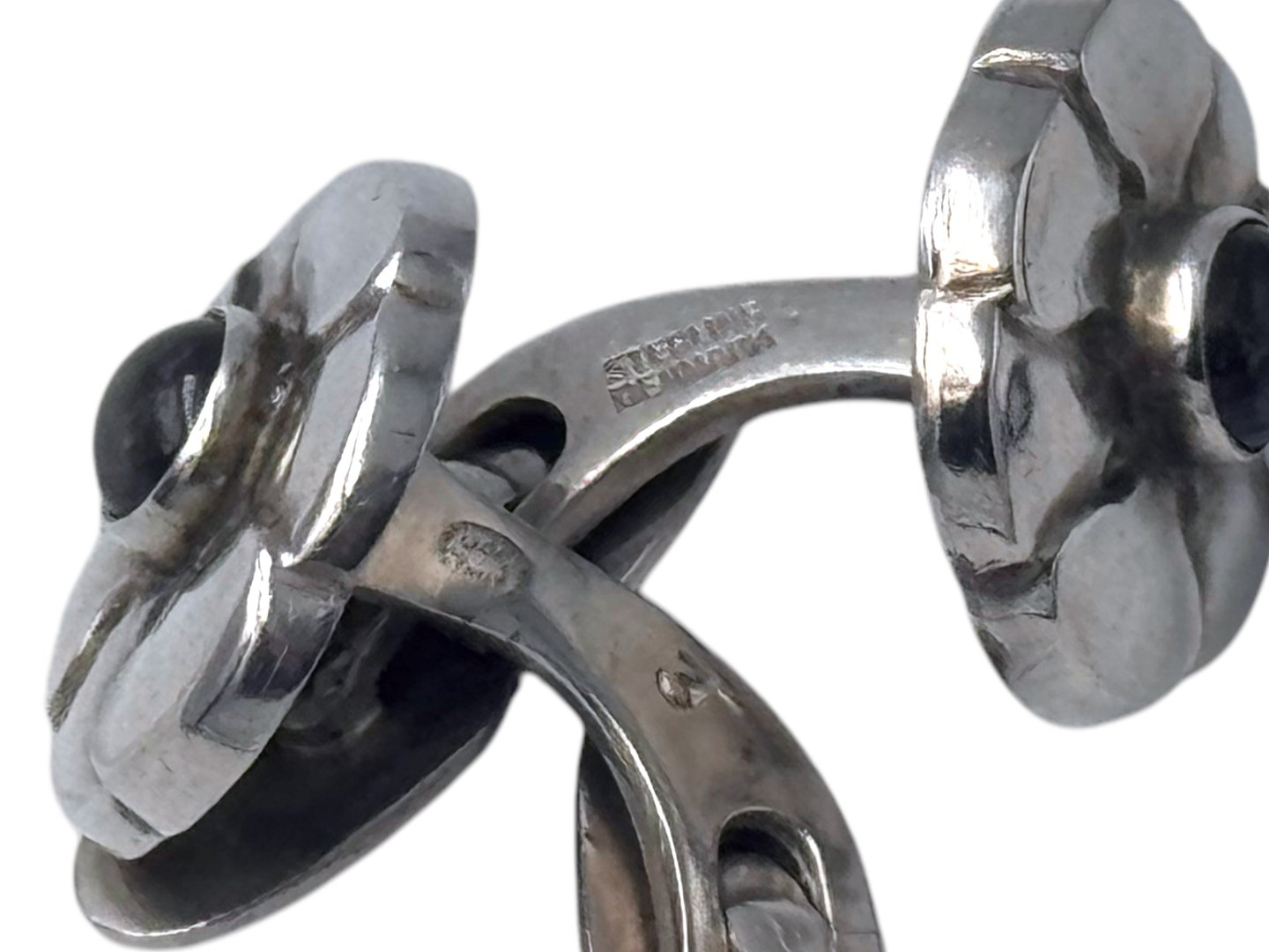 Georg Jensen sterlingsølv, par manchetknapper med blå sten. Designnummer 3. Selve manchetten måler 1,2 cm. i diameter. Fin og velholdt stand.