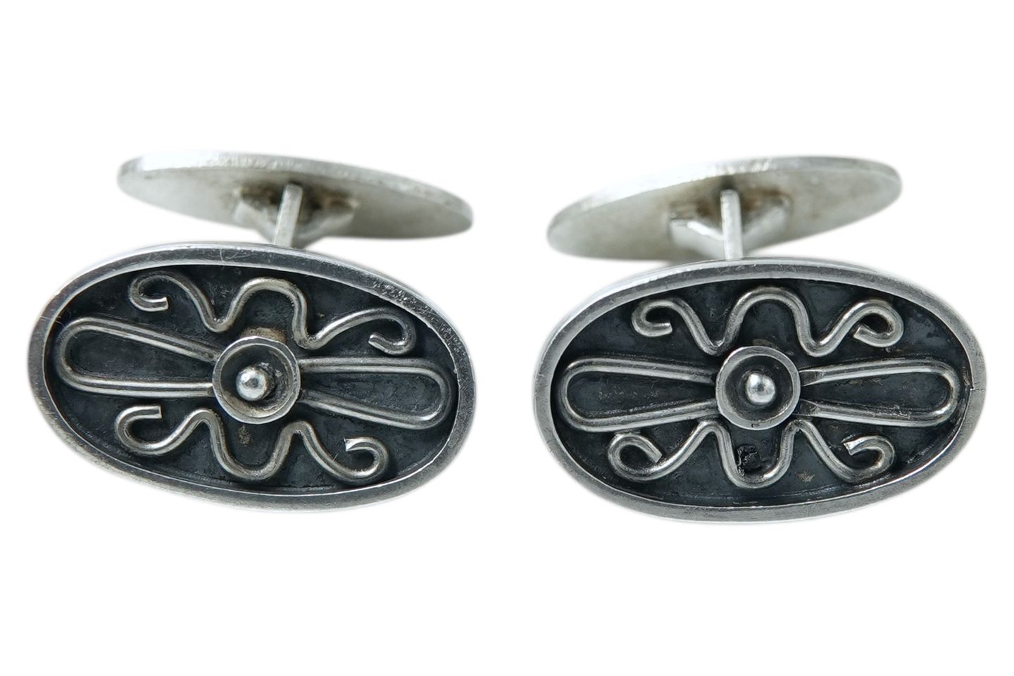 Manchetknapper med sortoxideret front. Stemplet "Chr V 830S". Christian Veilskov var sølvsmed i København fra 1963 til 1986. Disse er fra ca. 1960. De måler 2,1 x 1,2 cm. Fin og velholdt stand.