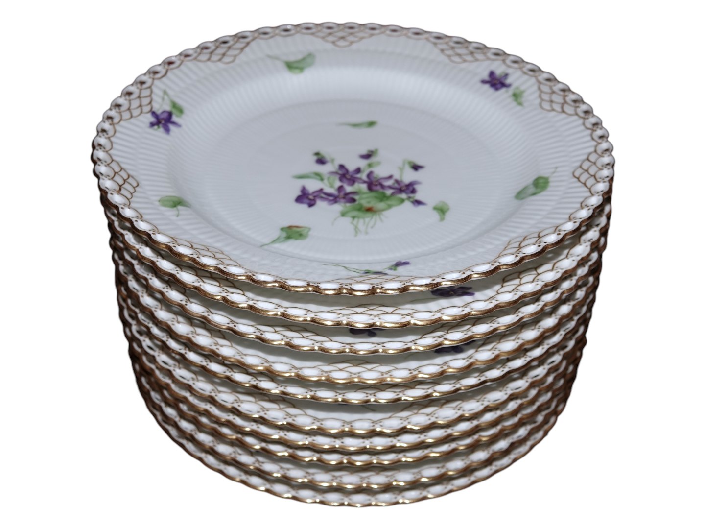 Royal Copenhagen Blå Violer Helblonde med guldkant, middagstallerken. Dekorationsnummer 6/1084. Disse er produceret mellem 1894 og 1897. 1. sortering. Diameter 24,4 cm. Perfekt stand uden fejl.