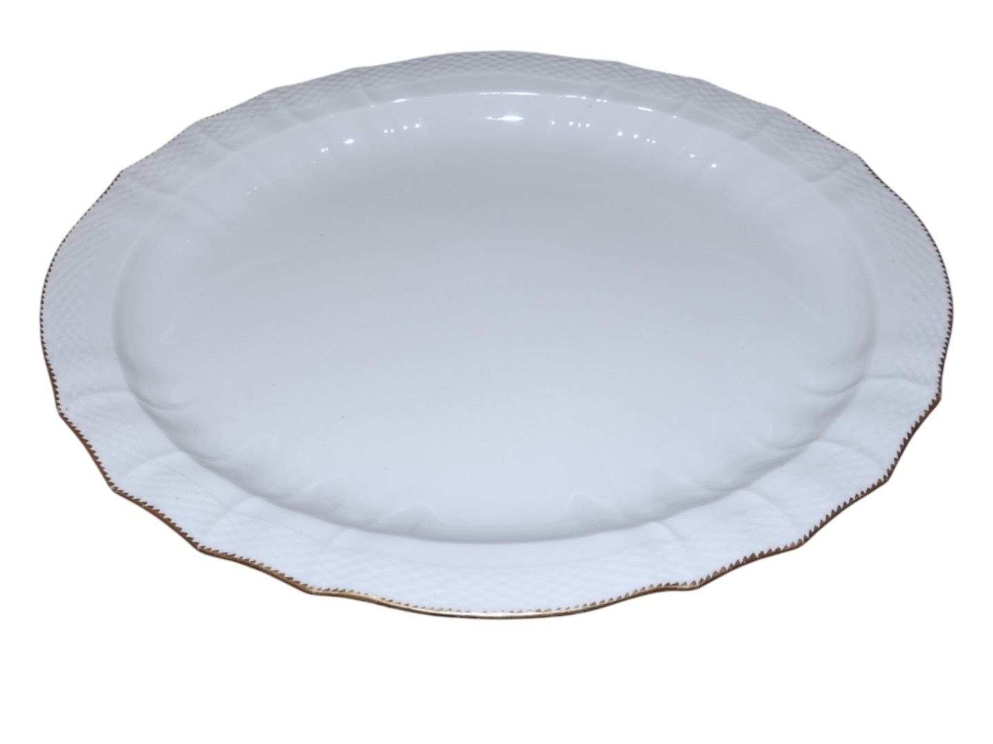 Royal Copenhagen Hvid Svejfet med takket guldkant (også kaldet Guld Takket), ekstra stort stegefad. Dekorationsnummer 387/1559. 2. sortering. Længde 48,0 cm. Der er let slid på guldkanten ellers perfekt stand uden fejl.