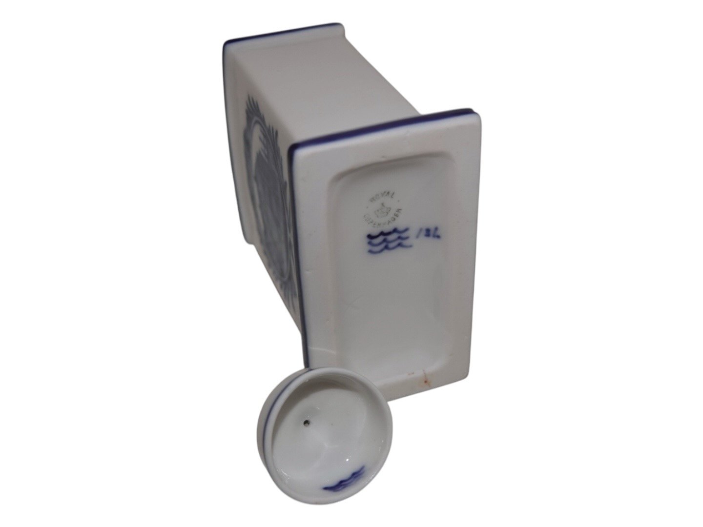 Royal Copenhagen lidded tea caddy with blue decoration. Factory first. Heitght 11.5 cm. Perfect condition.
