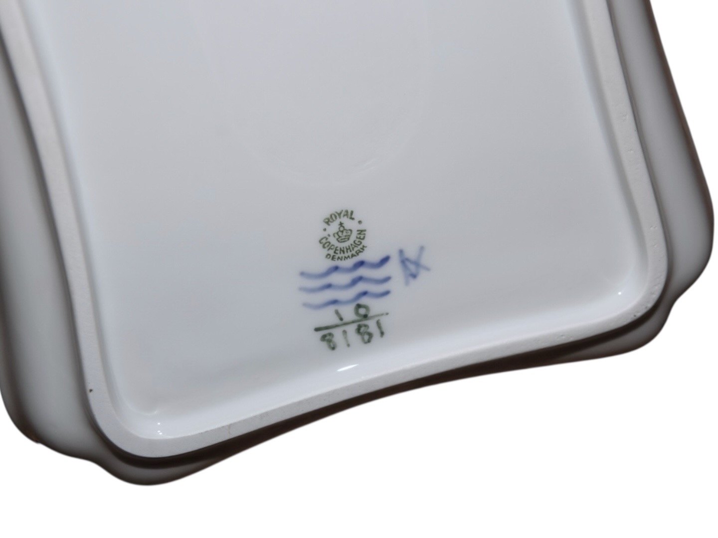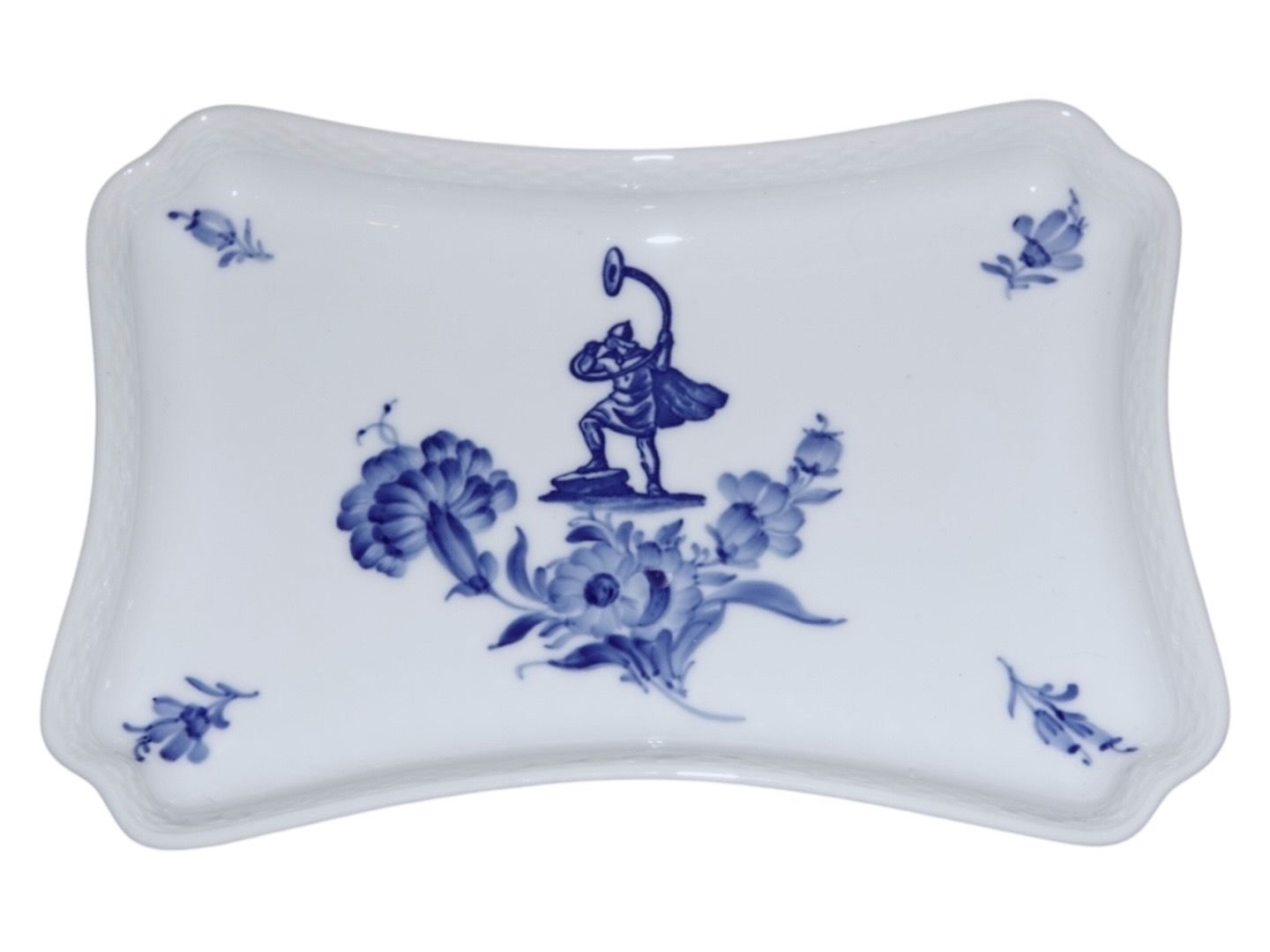 Royal Copenhagen Blue Flower Braided with man with a horn, square tray. Decoration number 10/8181. Factory first. Length 23.9 cm. Perfect condition with no chips, cracks or repairs.