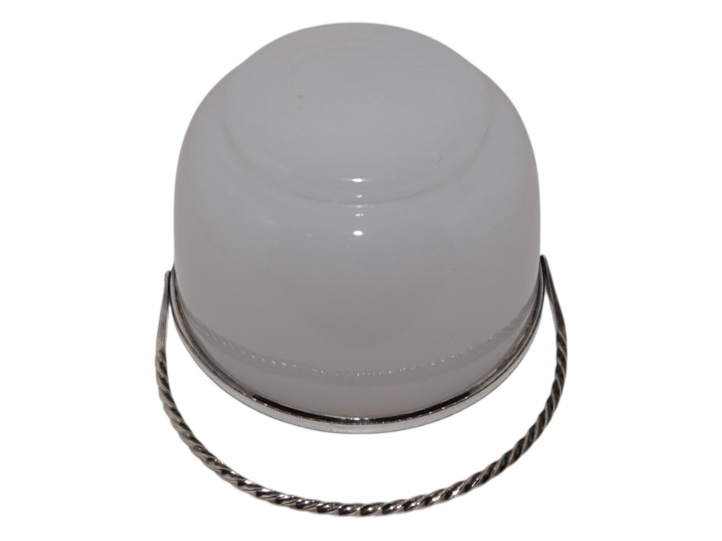 White opaline glass sugar bowl with silverplate handle from the 19th century. Diameter 12.0 cm., height 8.0 cm. There is an old inscription in the handle, please see the picture. Excellent condition.