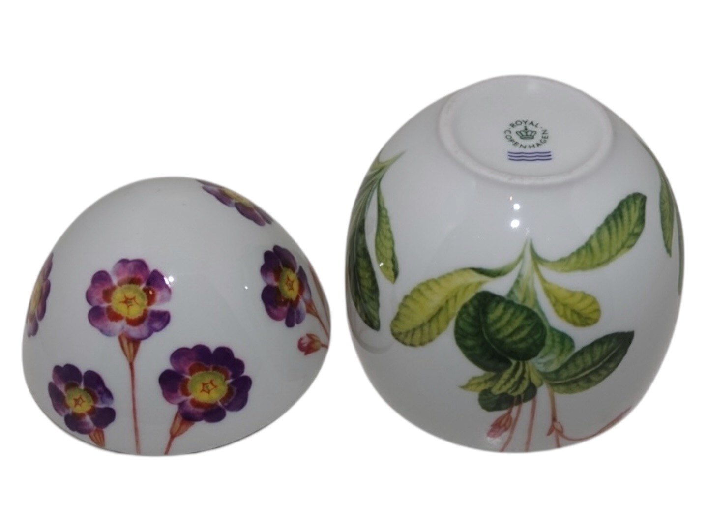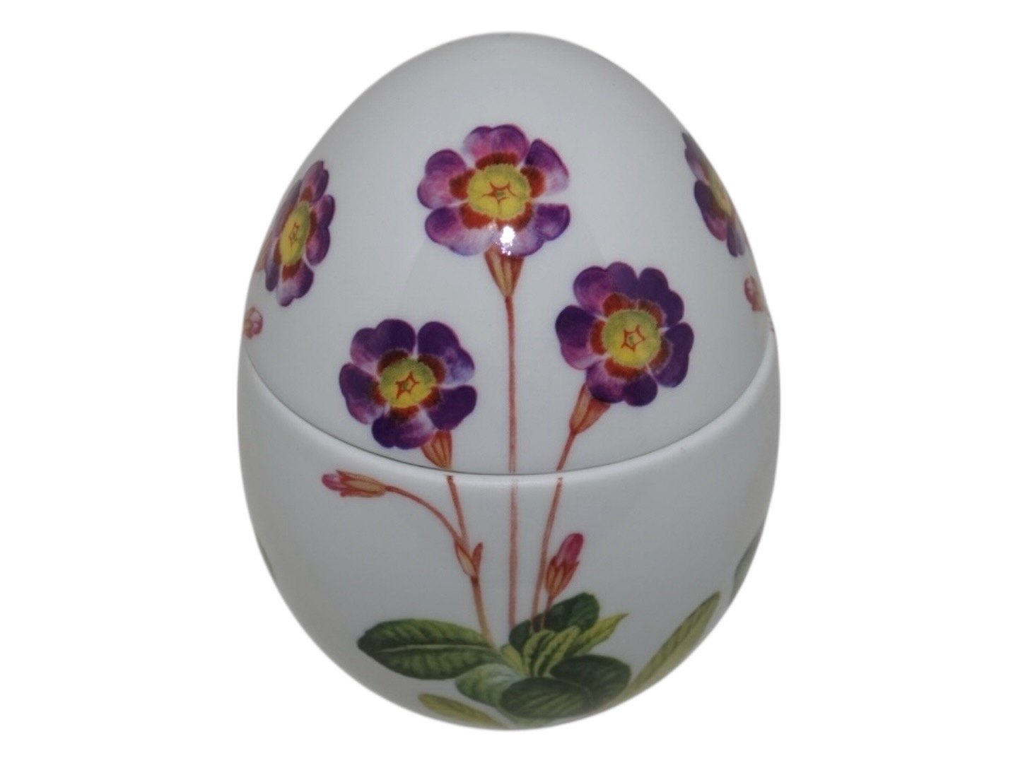 Royal Copenhagen påskeæg bonbonniere dekoreret med primula. 1. sortering. Højde 12,5 cm. Perfekt stand.