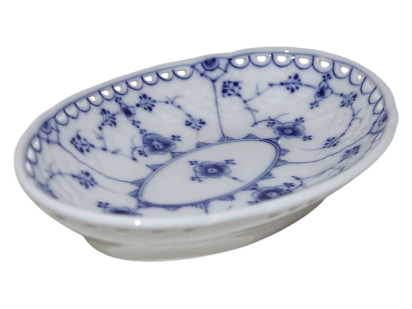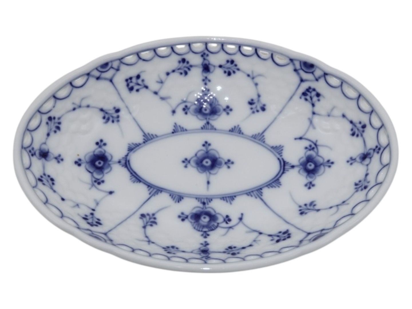 Bing & Grøndahl Blåmalet / Musselmalet, sjældent set mini fad med blondekant. Af fabriksmærket kan det udledes, at disse er produceret mellem 1915 og 1948. 2. sortering. Længde 18,0 cm. Perfekt stand uden fejl.