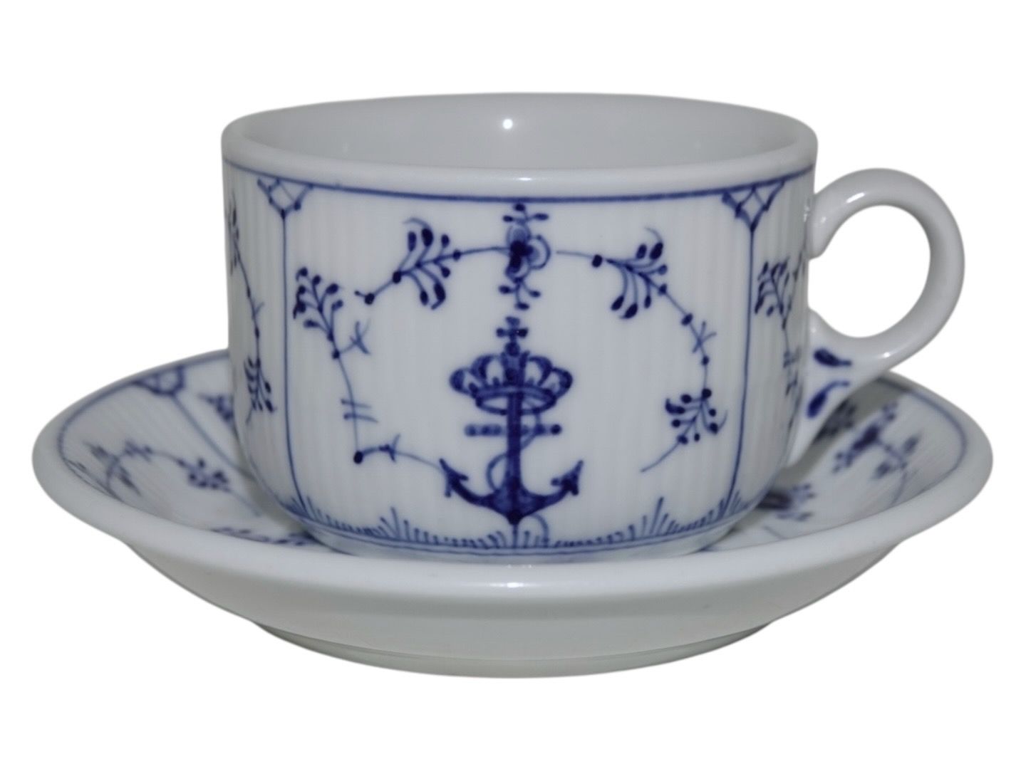 Royal Copenhagen Musselmalet Riflet Hotelporcelæn / jernporcelæn, sjælden og stor kop og underkop med logo fra Søværnet.