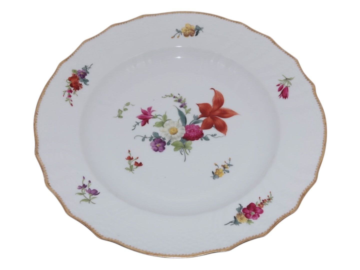 Royal Copenhagen Fuld Saksisk Blomst, lille middagstallerken. Disse er produceret før 1894. 1. sortering. Diameter 24,8 cm. Perfekt stand uden fejl.