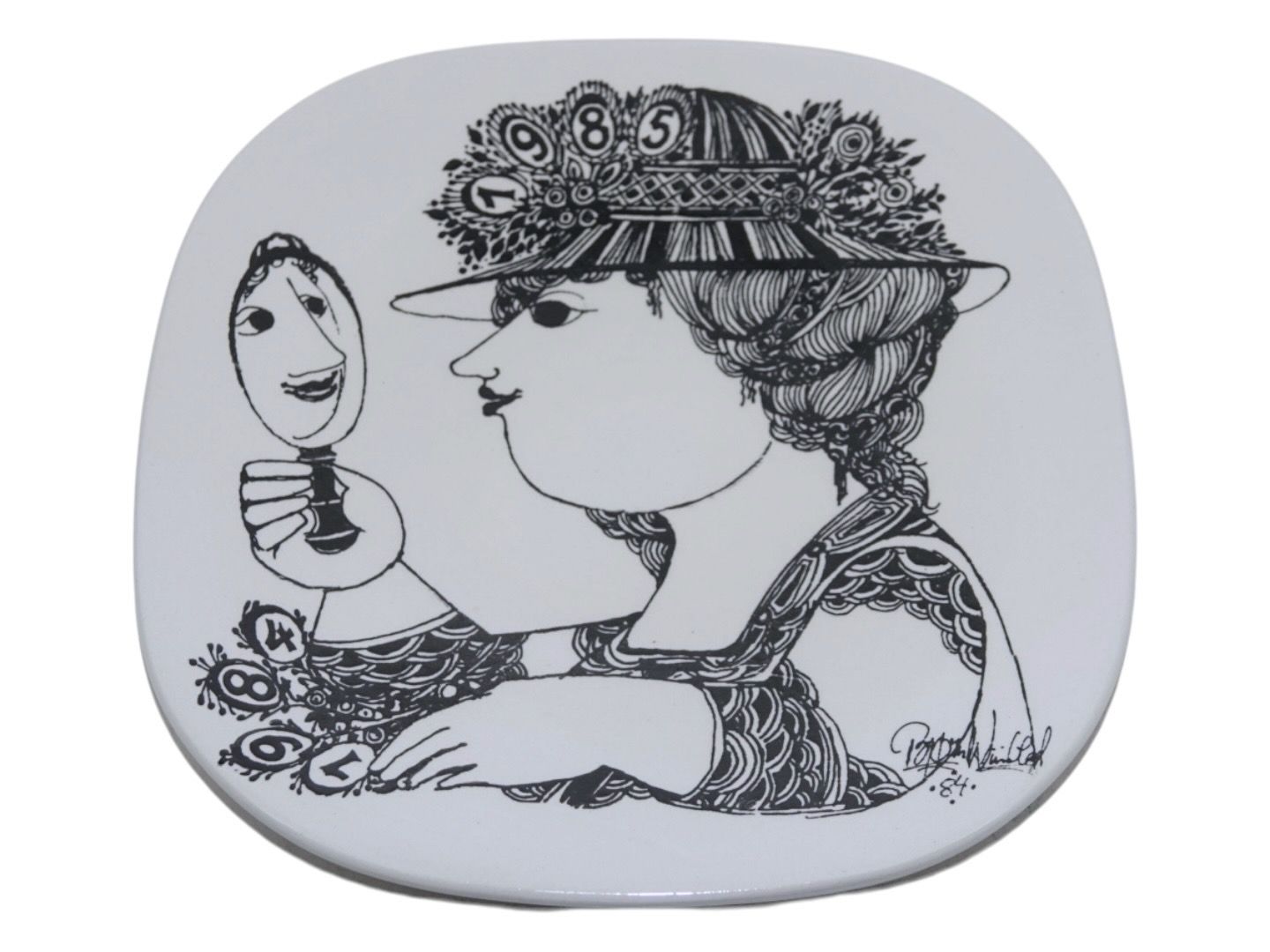Sort Bjørn Wiinblad årsplatte 1984-1985. Produceret hos Nymølle Keramik. Måler 18,8 x 18,8 cm. Perfekt stand.