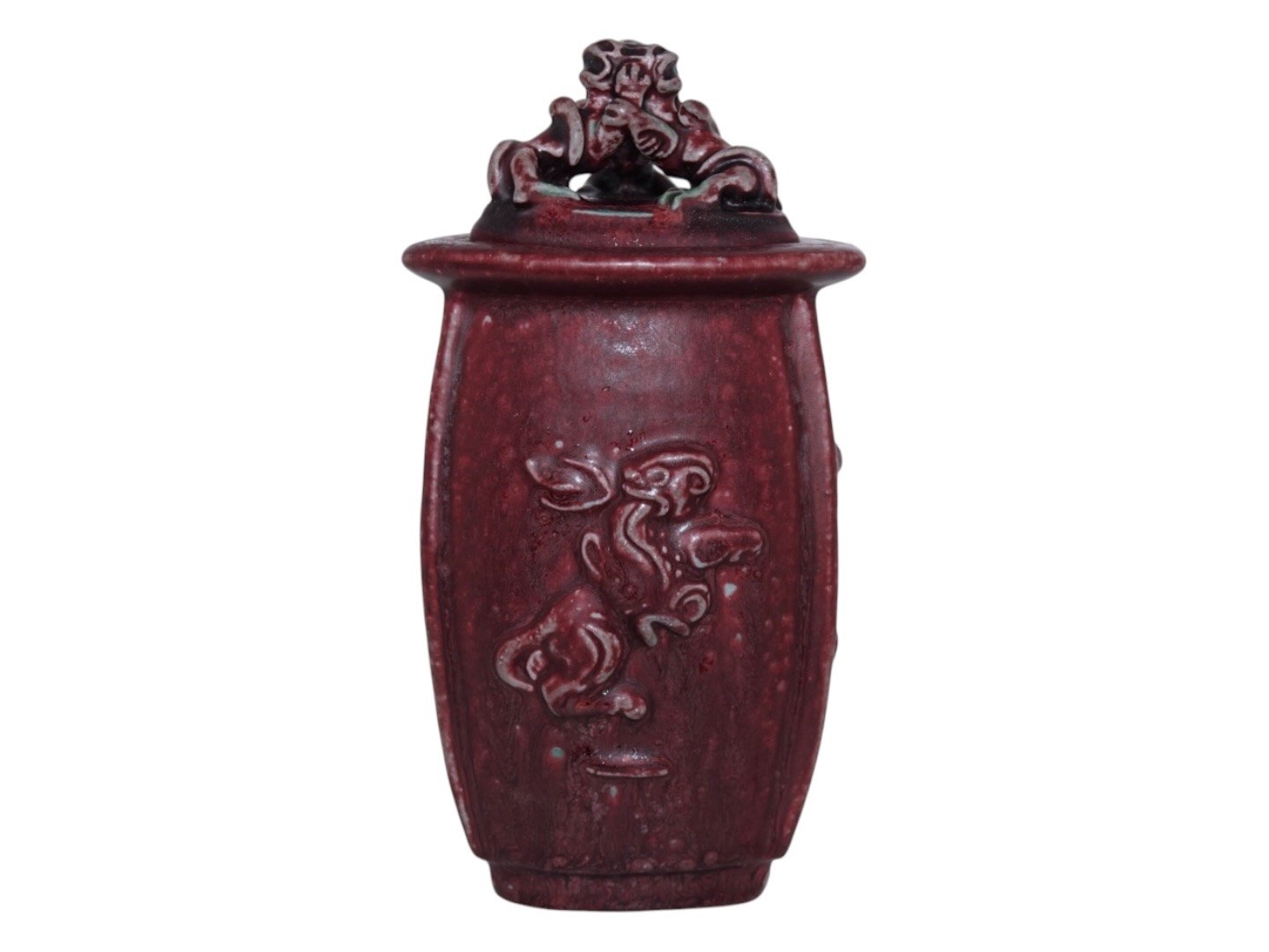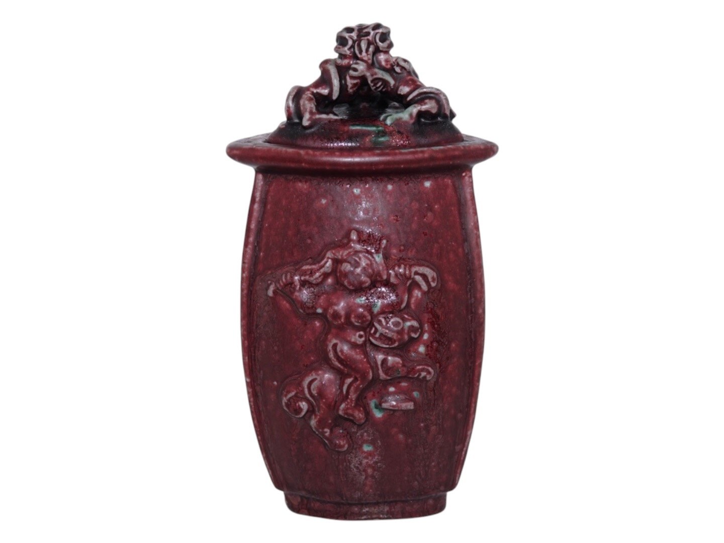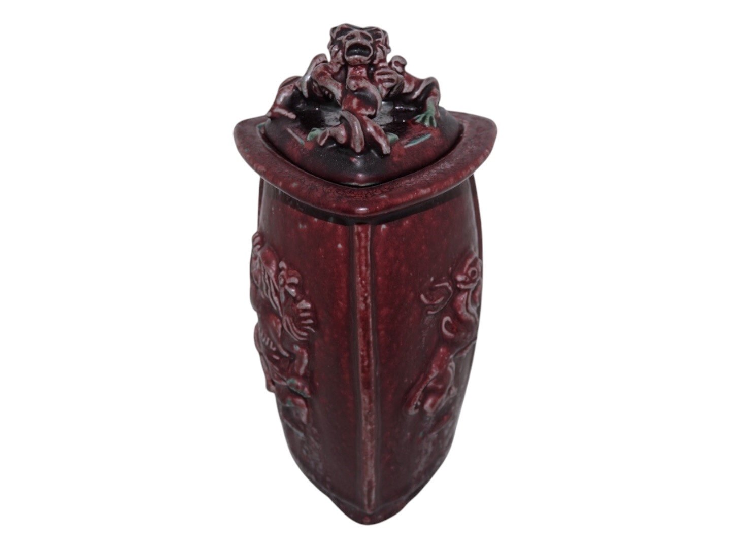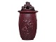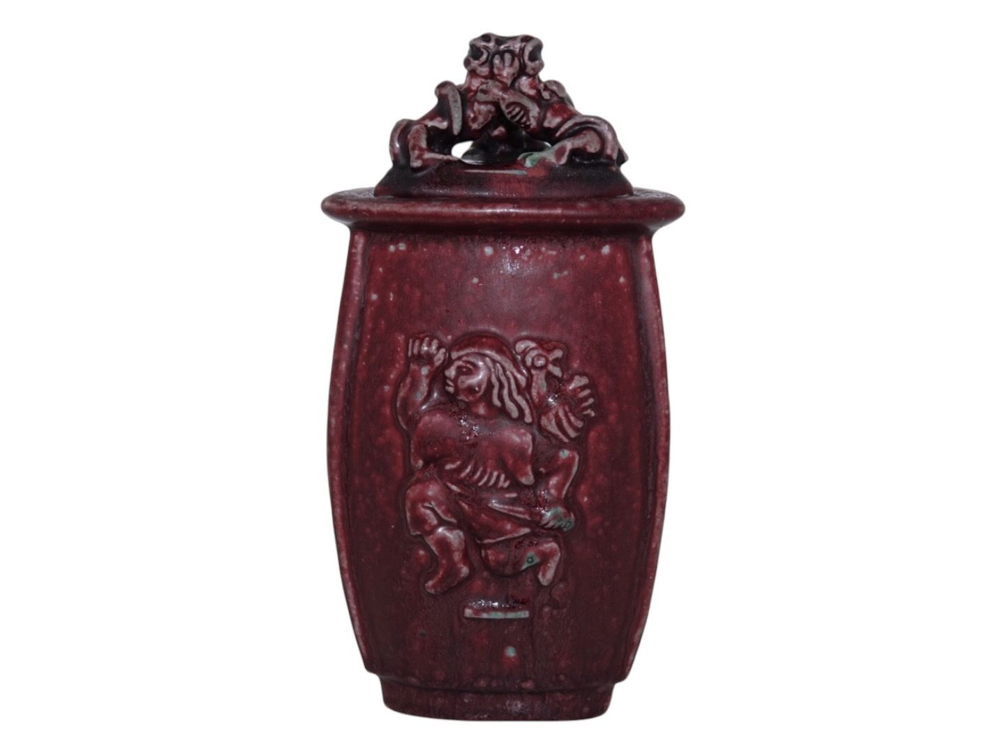 Royal Copenhagen keramik med rød okseblodsglasur, trekantet vase med låg udført og signeret af Bode Willumsen.