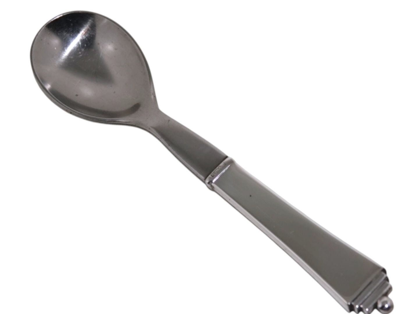 Georg Jensen Pyramide sterling sølv og rustfrit stål, æggeske. Længde 11,8 cm. Meget velholdt stand uden indgraveringer.