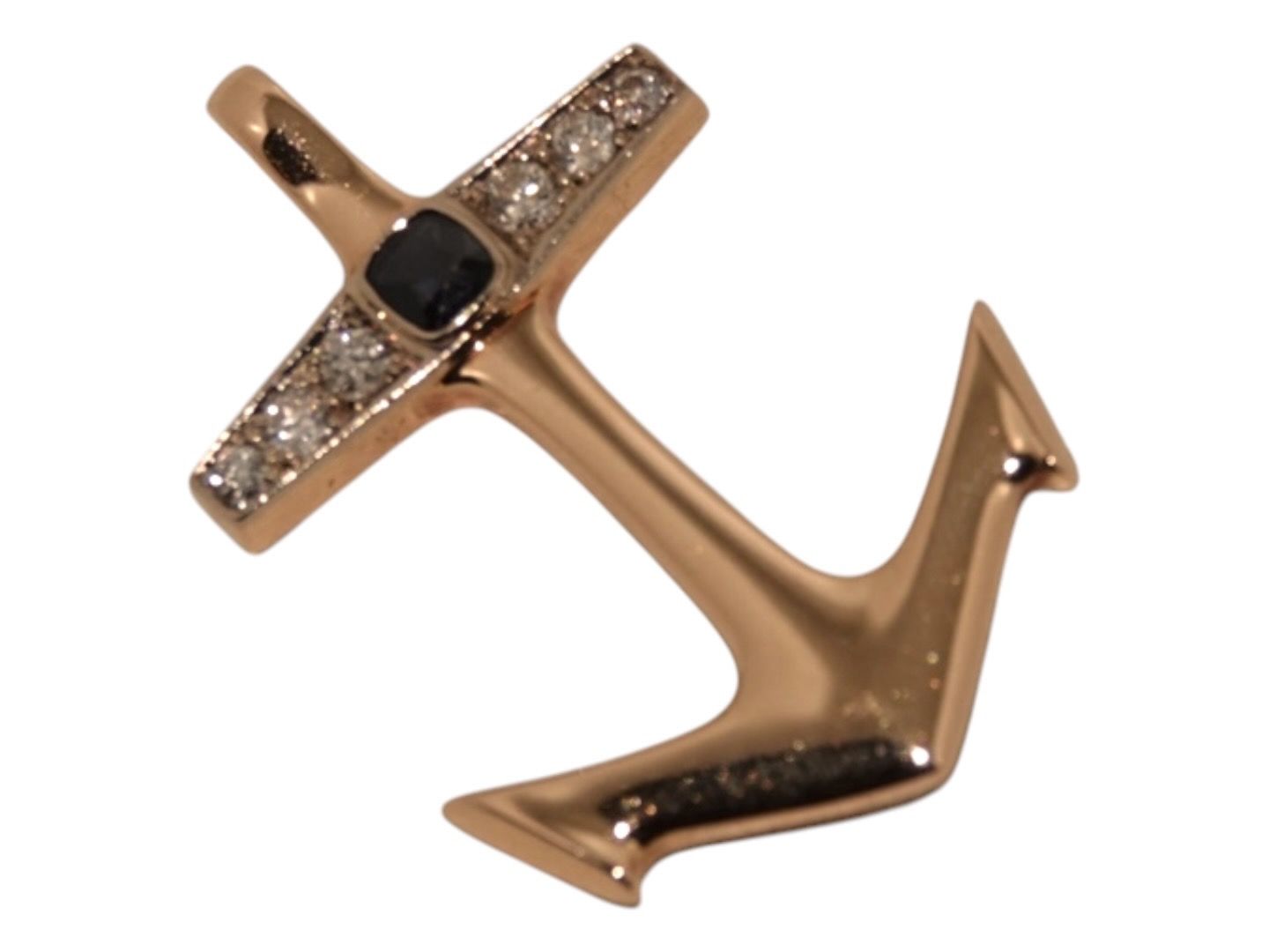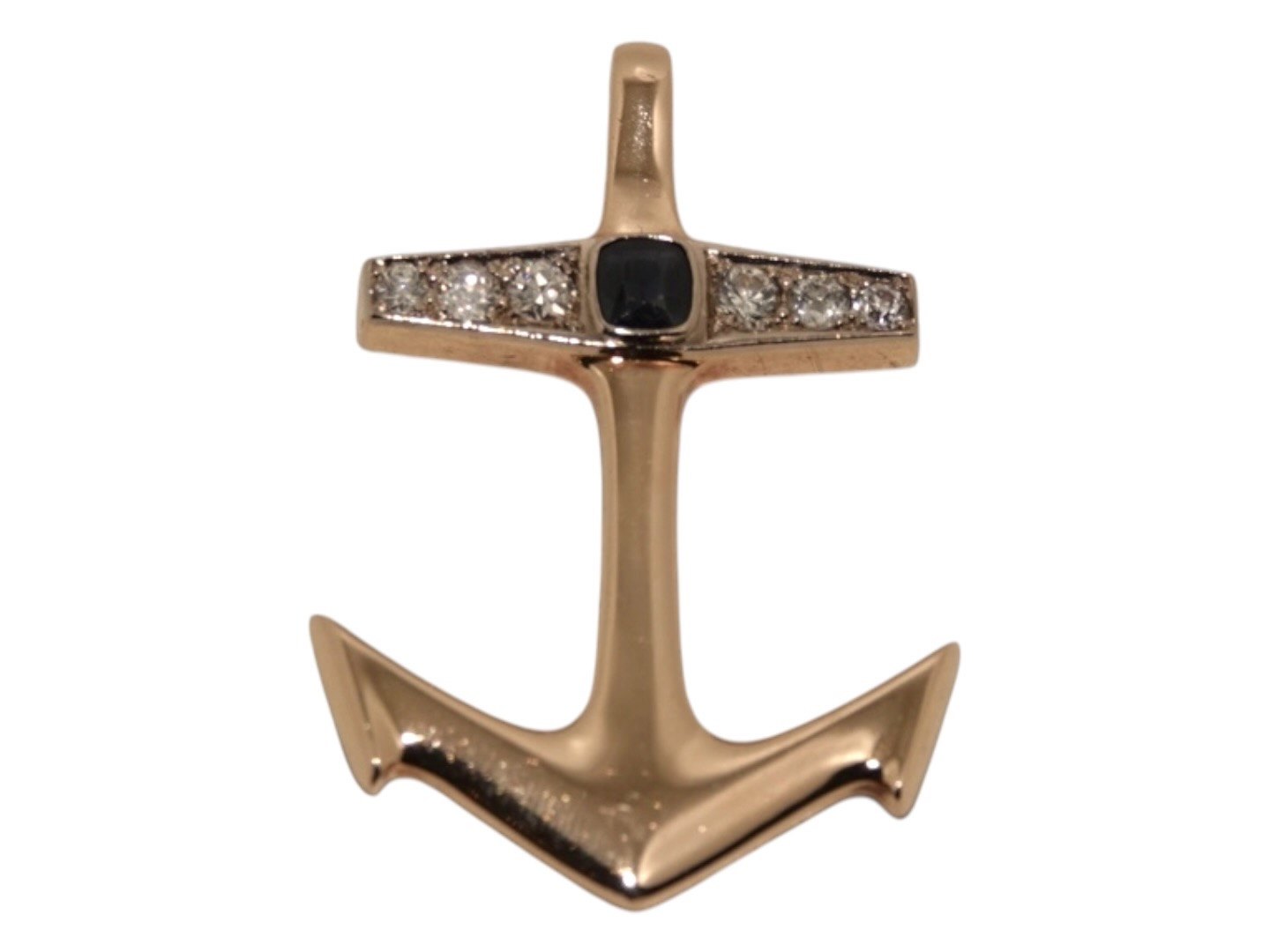 Bent Gabrielsen 14 karat guld stort vedhæng i form af anker med en ret stor blå safir og seks store safirer. Smykket er udført i en lækker tung kvalitet. Smykket kan både benyttes som en broche samt et vedhæng, da der både er øje til kæde samt nål.