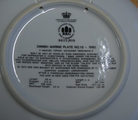 Bing & Grondahl marine plate No 13 from year 1983 with motif of Topsail schooner "Mercantic" 1942-1983 , in a mint condition.