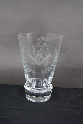 Danish freemason glasses, drinking glass engraved with freemason symbols, on thick, round feet.