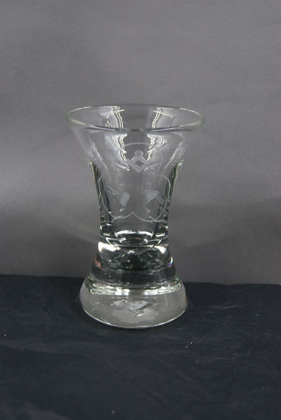 Danish freemason glasses, drinking glass engraved with freemason symbols, on thick, round feet.