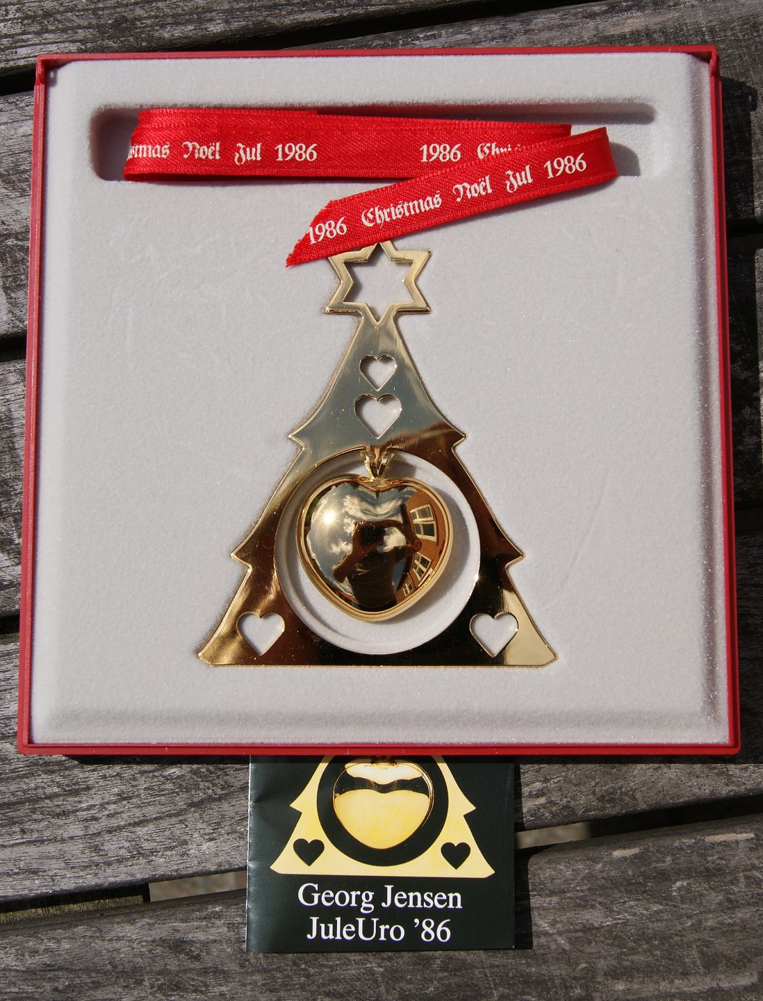 Weihnachtsmobile 1986 Weihnachtsherz aus vergoldet Messing von Georg Jensen, Dänemark. Georg Jensen Weihnachtsmobile 1986, Design von Sven Vestergaard, mit original rotes Band und Karton.