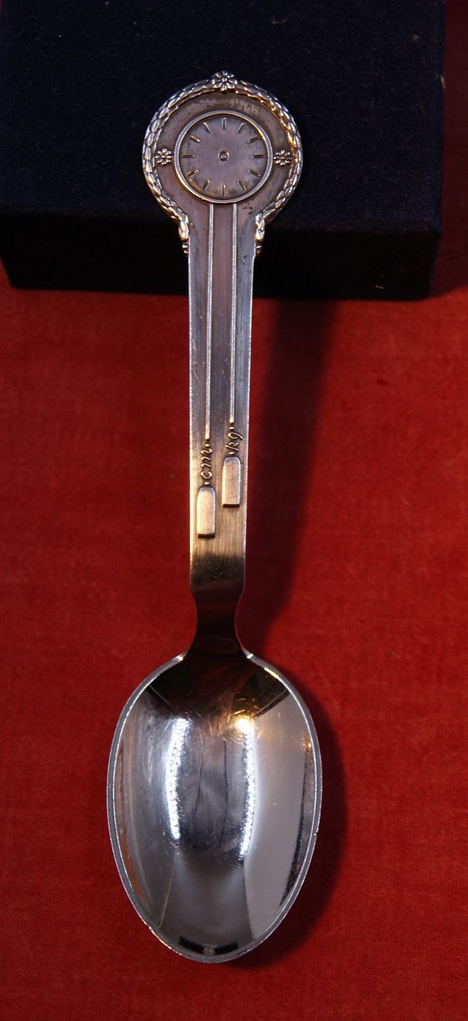 Klein Kind Löffel mit Uhr und Gewichten, in die Länge und Gewicht eingraviert werden können. Es ist in gutem, gebrauchtem Zustand, und ohne Inskriptionen.