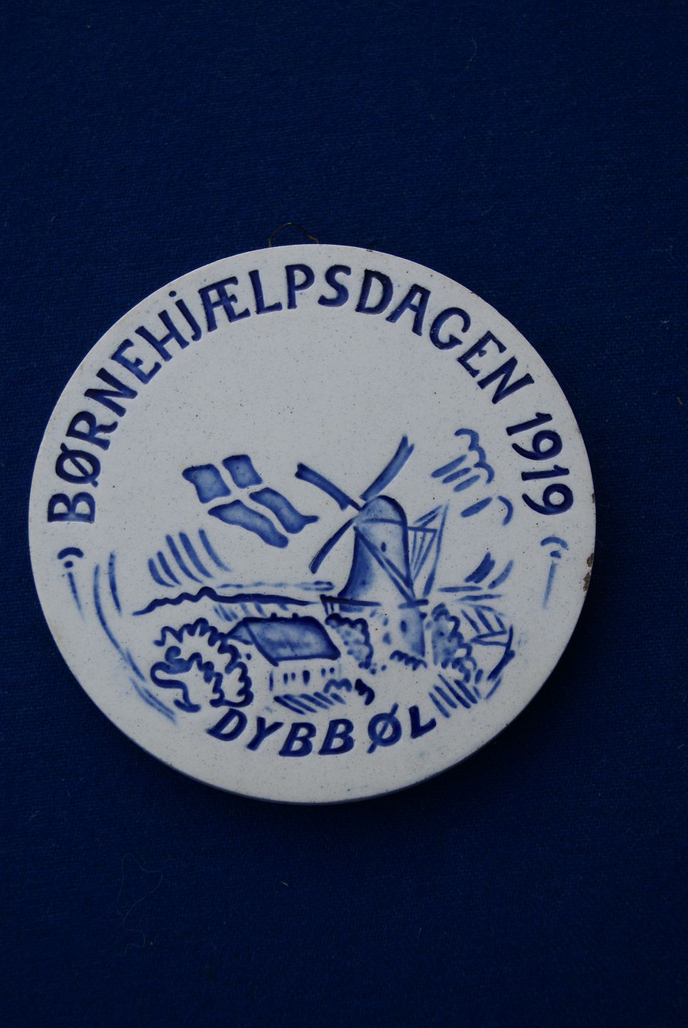 Børnehjælpsplatter i fajance. Børnehjælpsdagen 1919 med Dybbøl Mølle. Børnehjælpsdagsplatter i fajance.