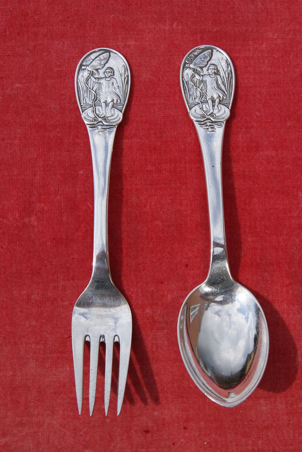Sæt med barneske og barnegaffel i pæn, brugt stand uden inskriptioner.