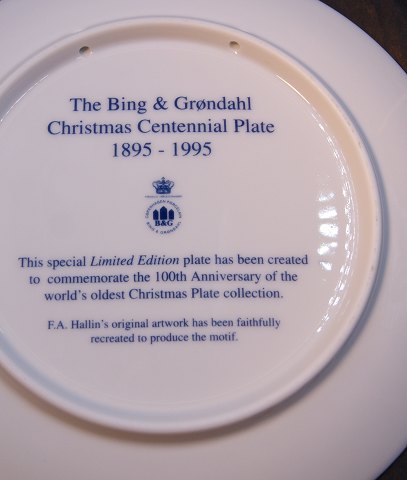 Bing & Grøndahl Jubilæumsplatte 1895-1995 i 1.sort. med guldkant og motiv fra den første Juleplatte fra 1895. Er i rigtig pæn stand.