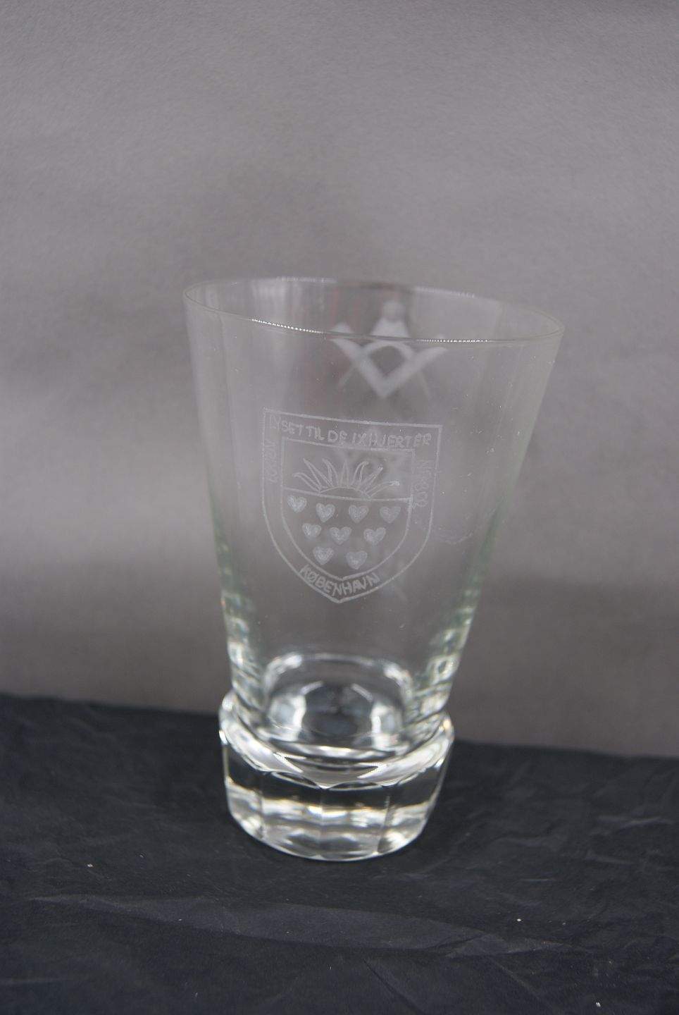Frimurer glas eller Loge glas, Ølglas dekoreret med slebne symboler, på kantsleben fod til NRBO2 i København.
