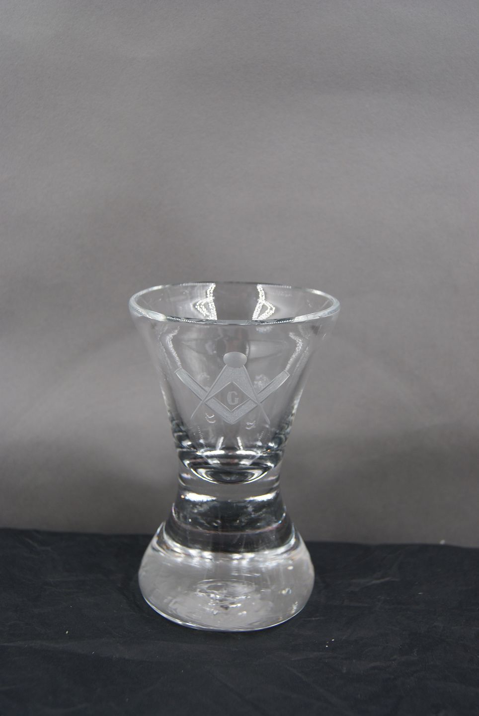 Frimurer glas eller Loge glas, drikkeglas dekoreret med slebne symboler, på tyk, rund fod.