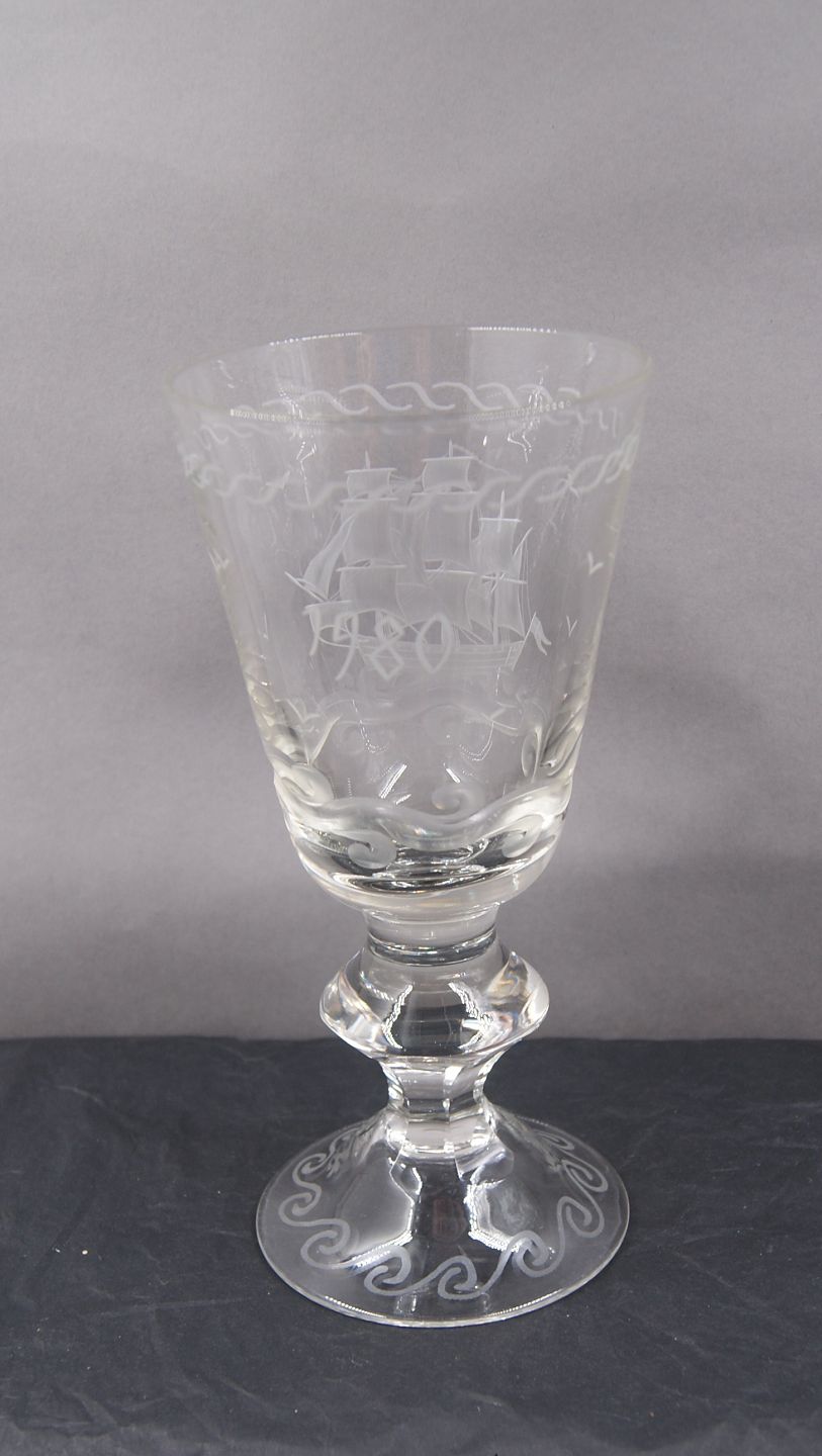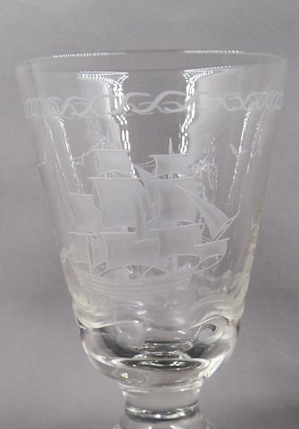 Stor og flot pokal ca.20cm i klart glas, smukt dekoreret med tremastet fuldrigger samt årstallet 1980.