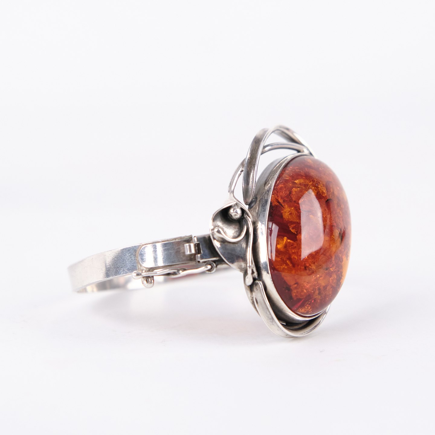 Armring i sølv med rav og sikkerhedslås. Unikt smykke design med rav.