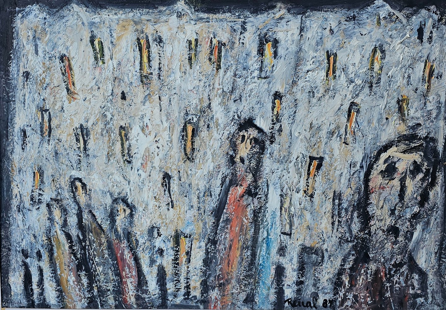Oliemaleri på papir med abstrakt motiv af mennesker. Monteret i sølvfarvet ramme, dateret 1987