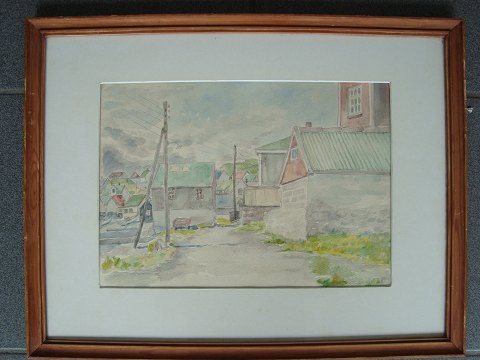 Akvarel af N. Chr. Brandt 1981 - Parti fra den færøske ø "Nólsoy"
