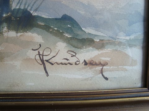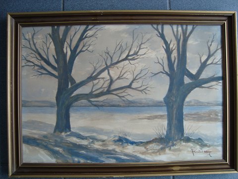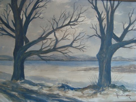 Akvarel Henning Knudsen - "Vinterparti med nøgne træer ved vej"