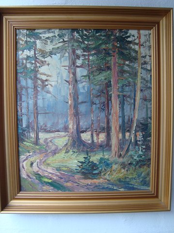 Maleri af G.W. Hill - "Nøgne nåletræer i skovbund"