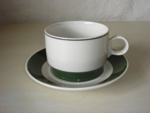 Taffel, Rørstrand, hvidt porcelæn med grøn kant. Tekop med underkop. Diameter 9 cm. Højde 6,5 cm. Pris: 75 kr. stk. Lager: 4