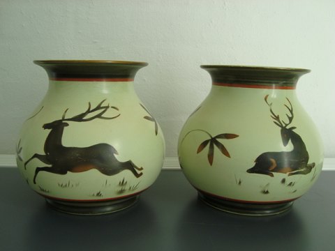Par fajance vaser dekoret med hjortemotiver på begge sider.