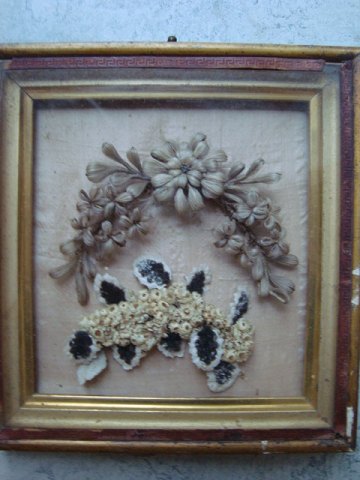 Stor buket lavet af hovedhår, samt en buket lavet af tørrede blomster - alt opsat på silke.