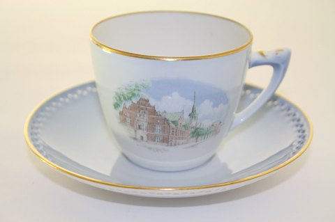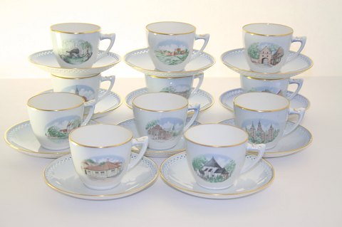 Danmarkstellet, Bing & Grøndahl, kaffekop med underkop med hulbort. Dekorationsnr. 305. Højde 6,5 cm. Forskellige motiver: