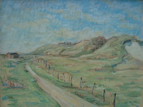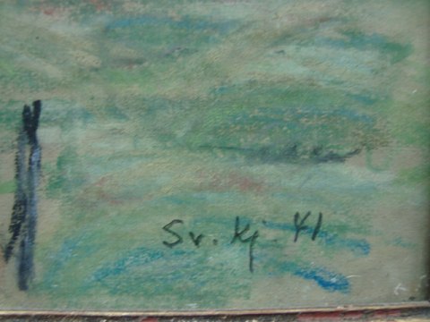 Akvarel/oliekridt af Svend Kjeldsen - landskab 1941.