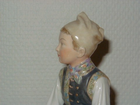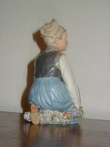 En flot figur fra Royal Copenhagen udført i overglasur forestillende dreng i Amager dragt med blomsterkrans. Dekoratiosnummer 12414. 1. sortering, højde 15 cm. Perfekt stand.