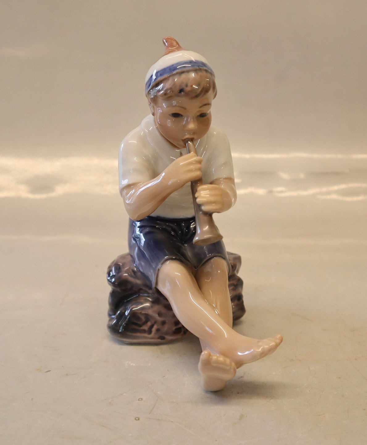 Dahl Jensen 1218 Dreng med trompet 14 cm (DJ). Den lille hornblæser. Mærket med kongelig krone og DJ Copenhagen i hel og fin stand.