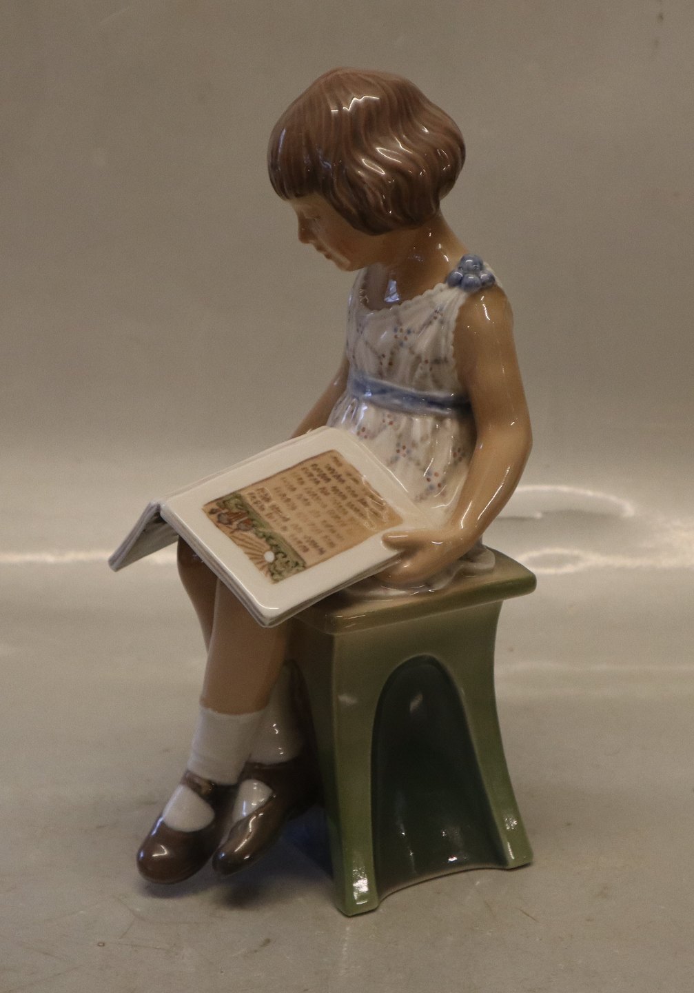 Dahl Jensen 1107 Pige med bog (DJ) 21 cm. 1. sortering Mærket med kongelig krone og DJ Copenhagen i hel og fin stand. Læsende pige