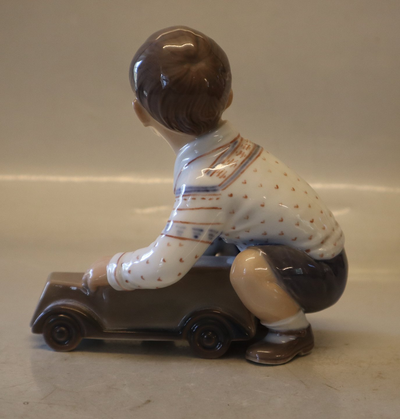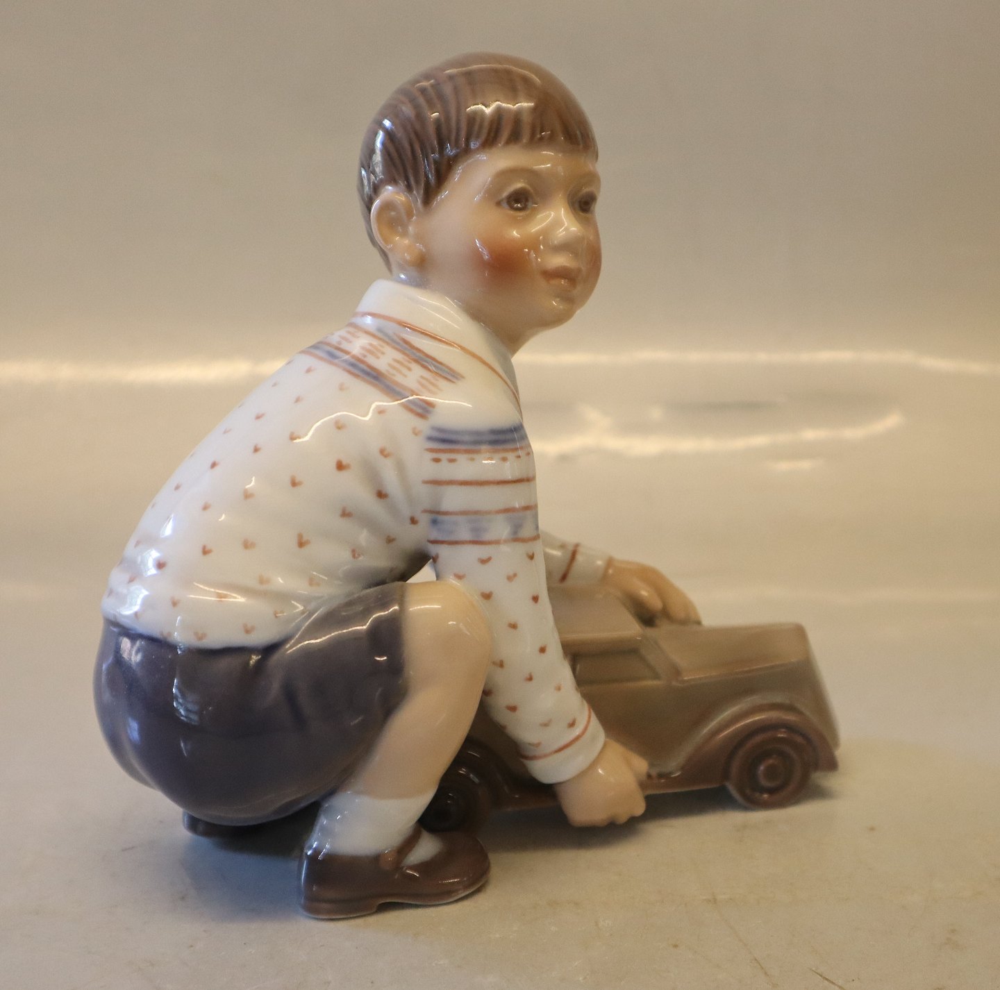Dahl Jensen 1166 Dreng med bil 14 cm (DJ). Mærket med kongelig krone og DJ Copenhagen i hel og fin stand.